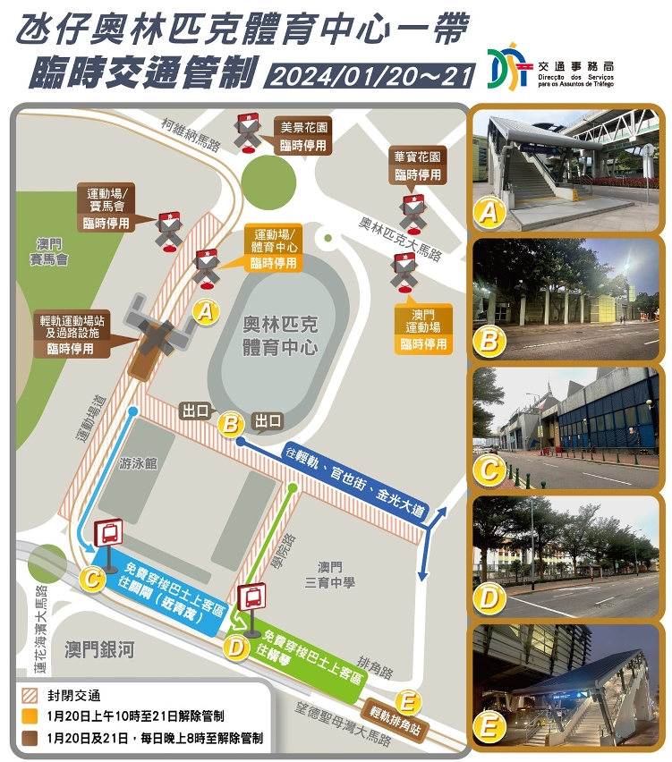 配合私人娛樂公司舉辦演唱會,1月19日(周五)至21日(周日)期間,氹仔奧林匹克體育中心-運動場周邊將實施一系列臨時交通措施。其中,配合警方在有需要時實施人流管制,“澳門運動場”站及“運動場/體育中心"站於1月20日(周六)上午10時起至21日(周日)臨時停用;而“華寶花園”站、“美景花園”站、“運動場/賽馬會”站及輕軌運動場站的行人天橋則於1月20日及21日每日晚上8時起臨時停用,直至解除管制,期間,輕軌運動場站亦會實施暫不上落措施,乘客可使用其他周邊巴士站搭乘相關路線,詳情請參閱兩巴網頁(http://www.tcm.com.mo 及http://www.transmac.com.mo)。