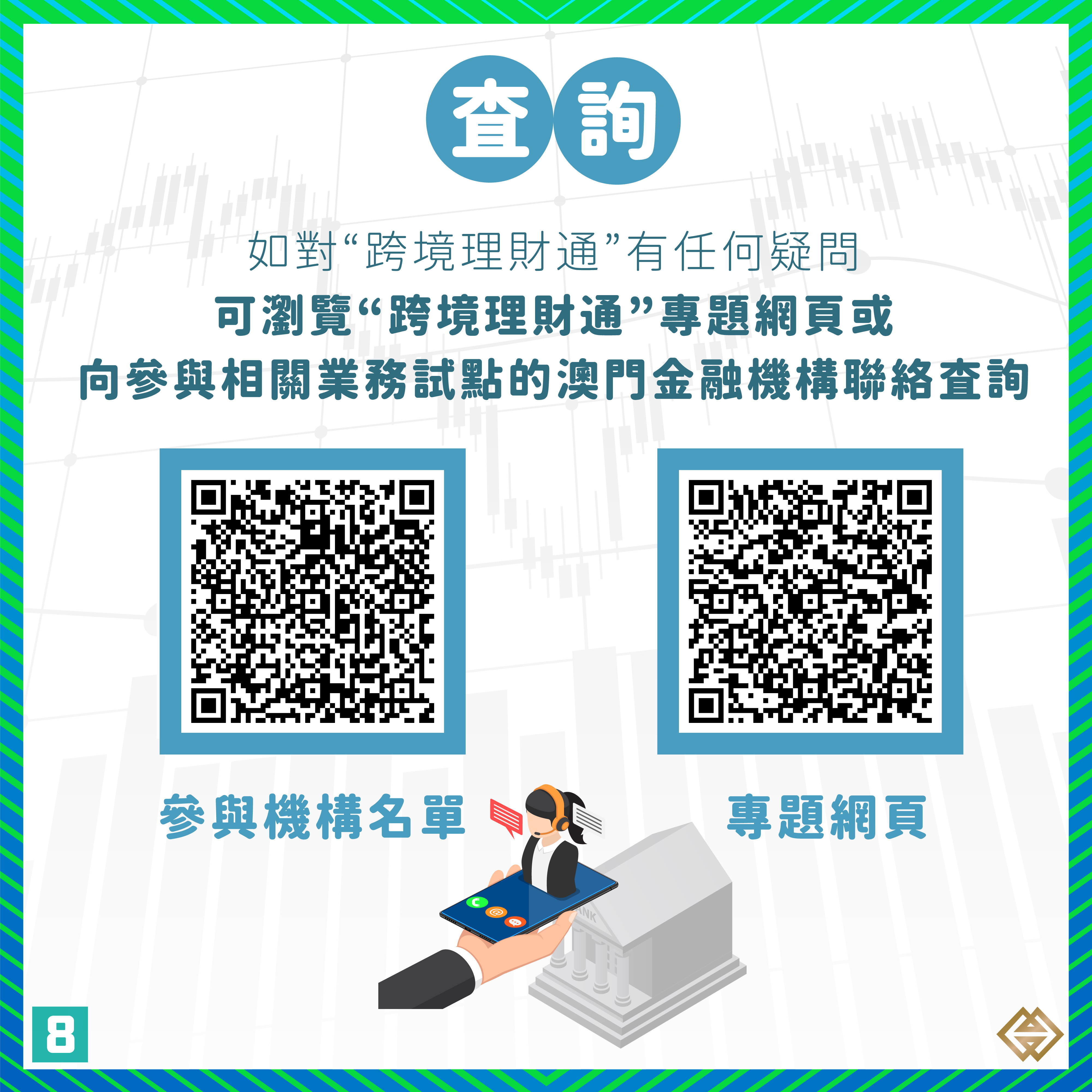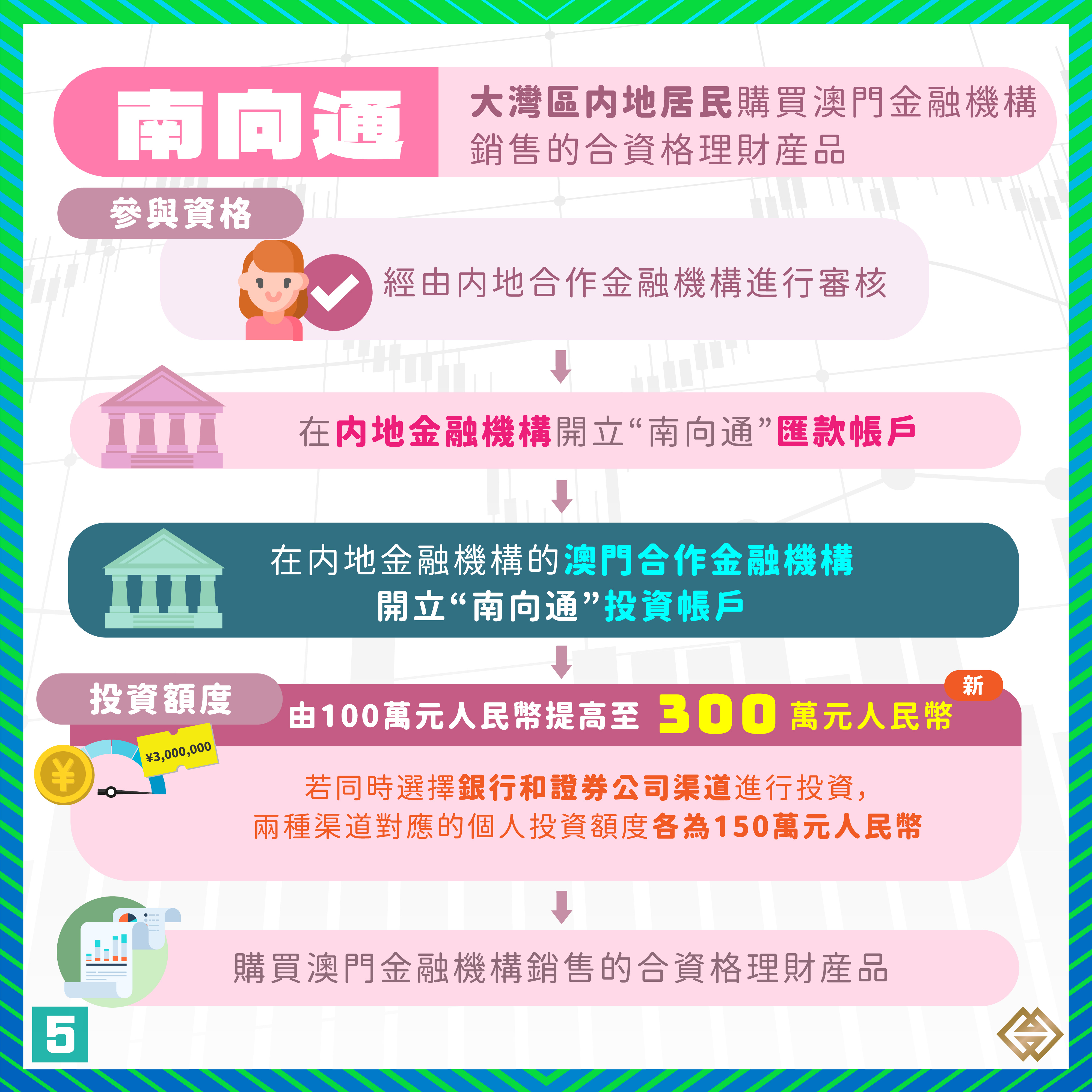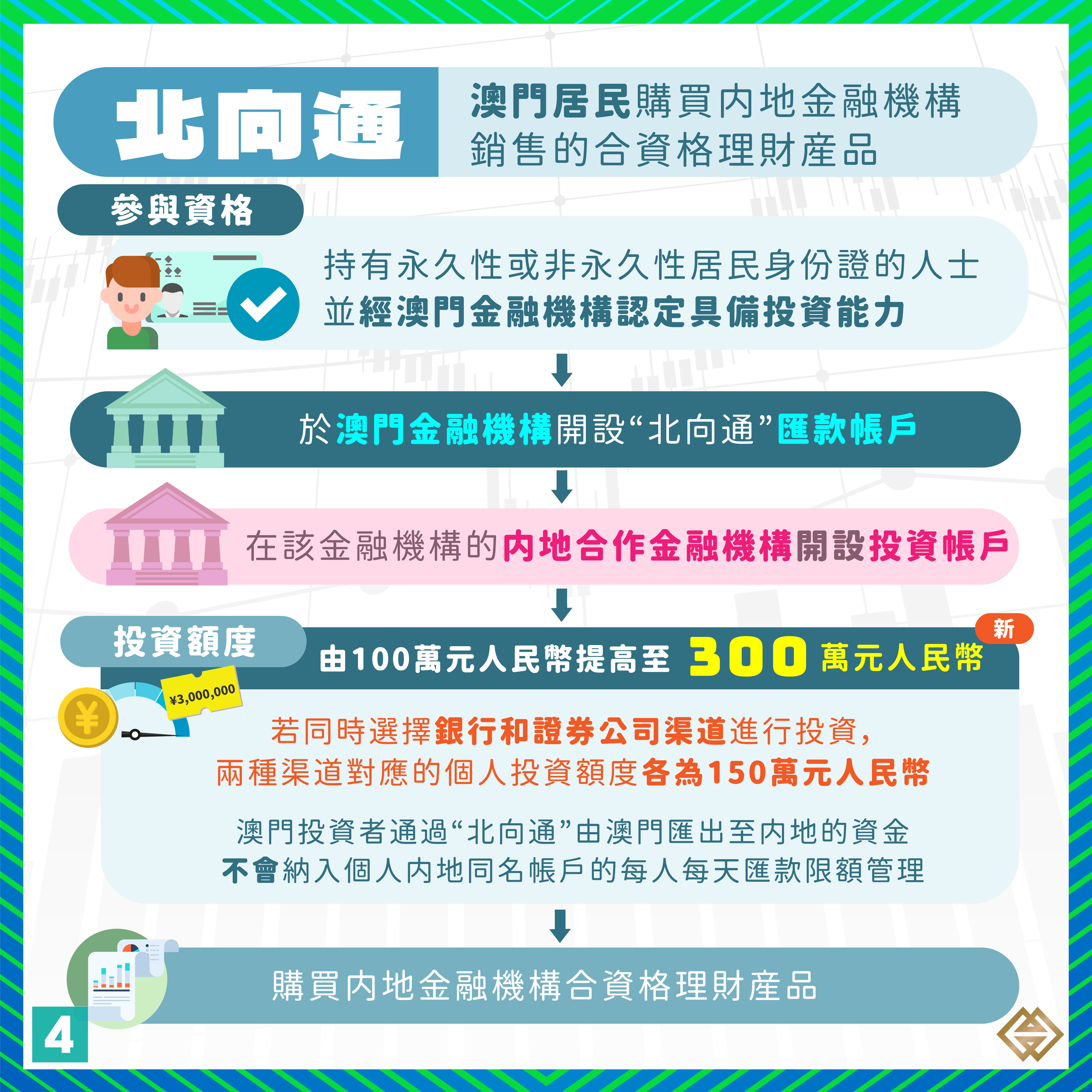 按照澳門金管局新頒佈的《實施細則》,除了澳門銀行可開展“跨境理財通”業務外,獲許可在澳門提供證券服務的金融機構(“證券公司”)(詳閱參與機構名單:https://www.amcm.gov.mo/zh-hant/news-notice/cross-border-financial-management/cross-border-financial-management-participating-agencies),亦可按照《實施細則》的規定開展“跨境理財通”業務。另外,投資者可購買更多元的合資格理財產品,其個人投資額度亦由100萬元人民幣提升至300萬元人民幣。投資者若同時選擇銀行和證券公司渠道進行投資,兩種渠道對應的個人投資額度各為150萬元人民幣。