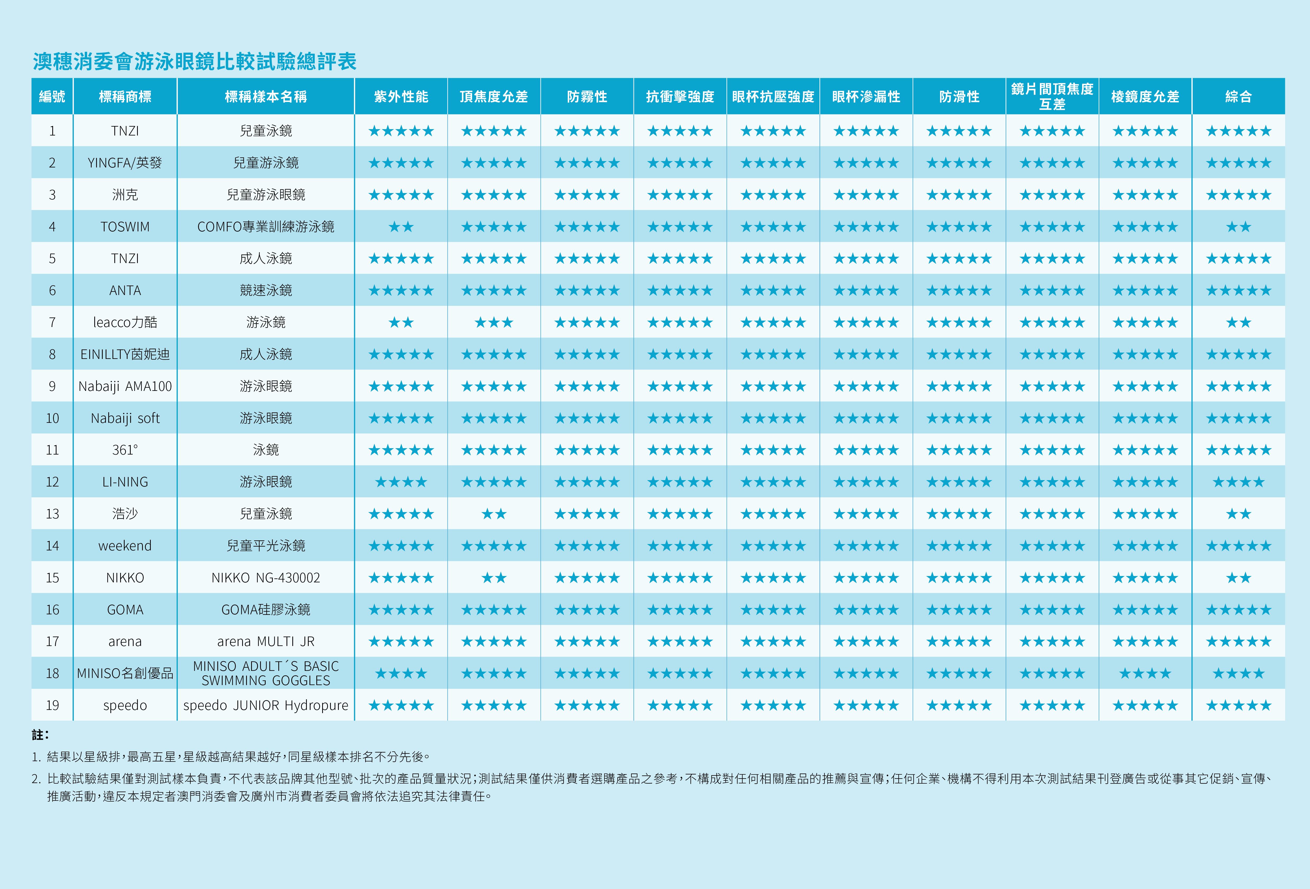 澳門與廣州市消費者委員會聯合比較試驗兩地19款游泳眼鏡,測試泳鏡的紫外性能及抗衝擊強度等項目,分析報告中的測評有助消費者科學與審慎選購到合適的游泳眼鏡。