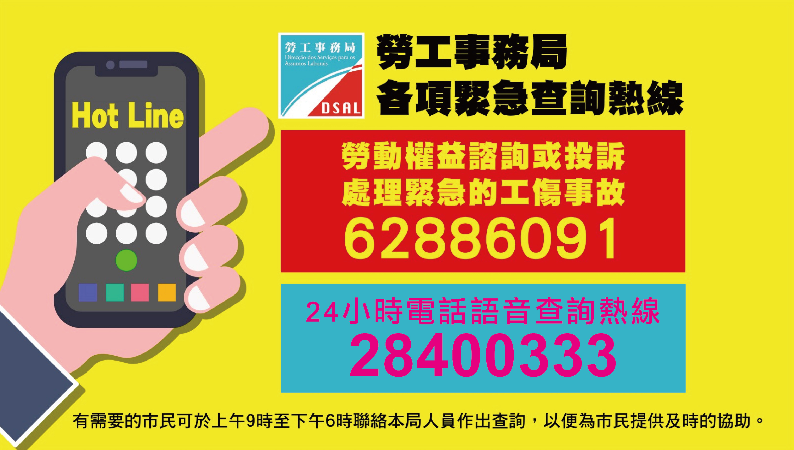 為了協助市民處理緊急的勞資糾紛或工傷事故,勞工事務局將在公眾假期期間(2024年2月9日下午至14日),特設緊急熱線電話62886091,有需要的市民可於上午9時至下午6時聯絡本局人員作出查詢,以便為市民提供及時的協助。