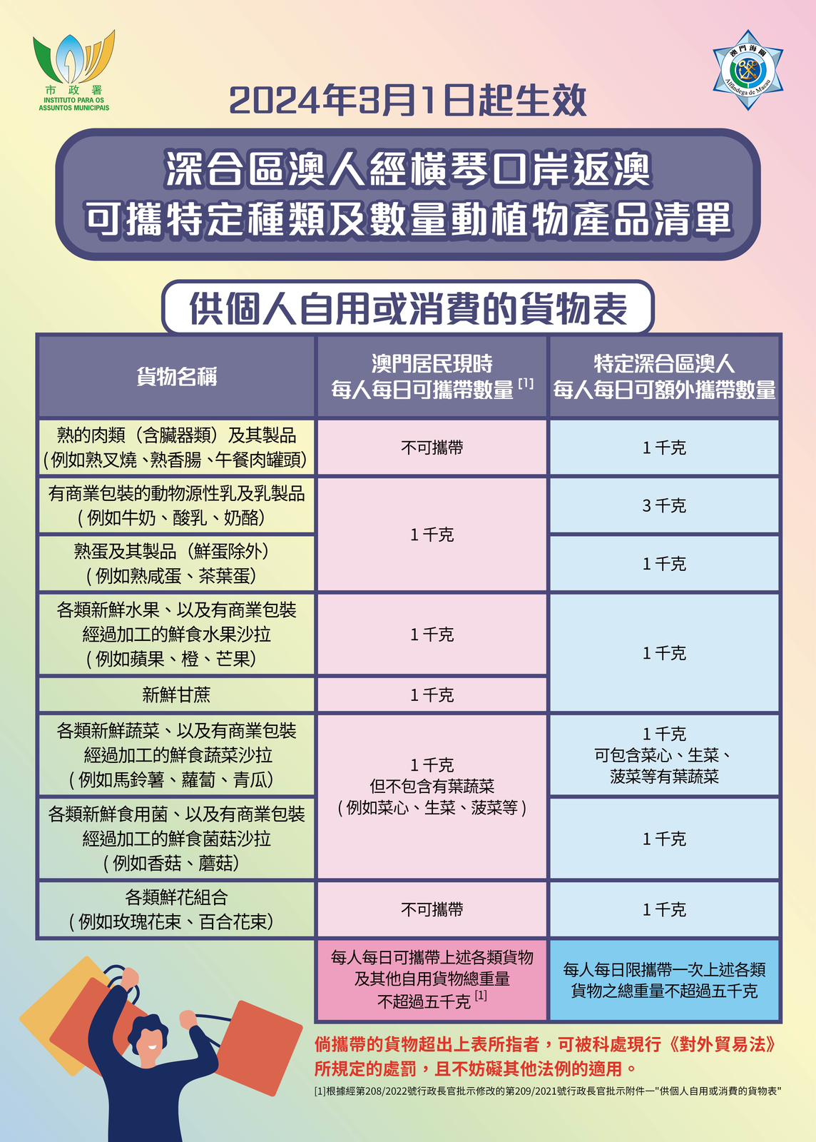 3月1日實施的新措施將允許在深合區居住或就業、且已納入“適用人員名單庫”的澳門居民,可經由橫琴口岸攜帶供個人自用,且每人每日一次可攜帶貨物總重量不超過五千克的特定種類及數量的動植物產品返回澳門,無需申請進口准照或作出相關申報。有關產品包括:熟的肉類(含臟器類)及其製品、各類蔬菜水果、各類鮮花組合等。通關時,海關會進行關檢工作,如符合條件將給予便利通關。