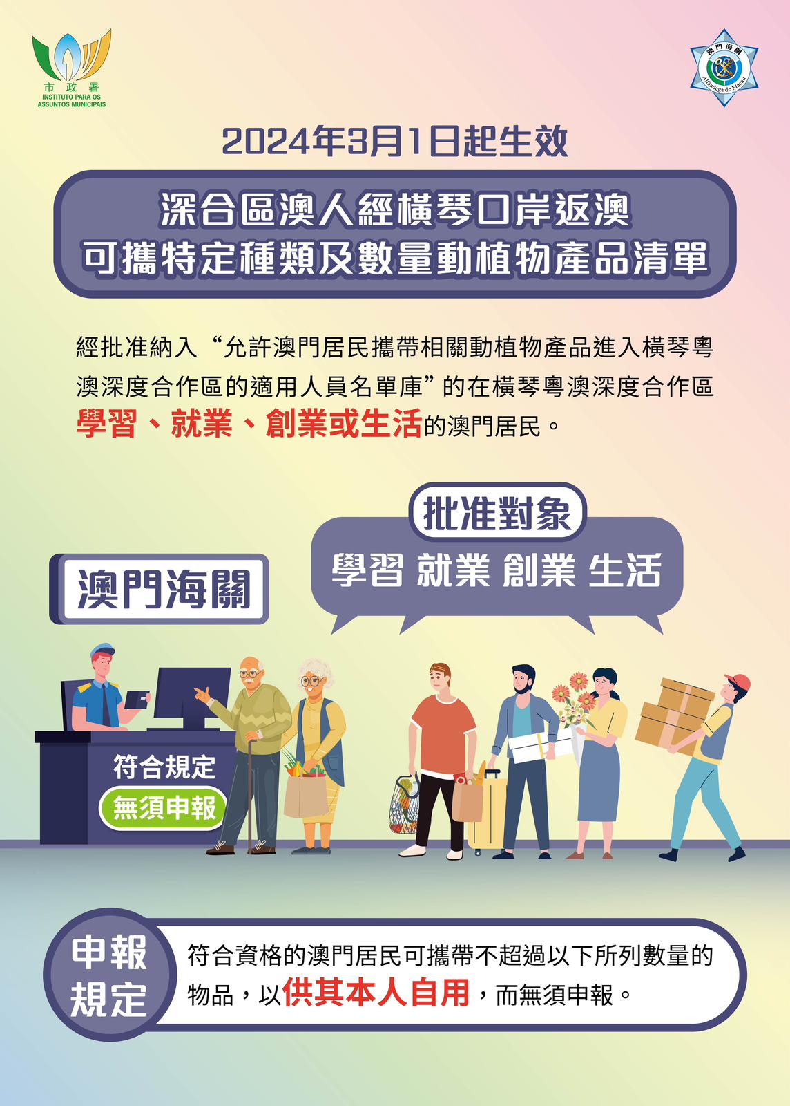 配合深合區“一線放開,二線管住”分線管理模式更好地落實,實現澳門與深合區之間進一步便捷流通。自3月1日起,在橫琴粵澳深度合作區學習、就業、創業或生活,且已納入“允許澳門居民攜帶相關動植物產品進入橫琴粵澳深度合作區的適用人員名單庫”(“適用人員名單庫”)的澳門居民,可攜帶供其本人自用,且符合特定種類及數量的食品及鮮花等動植物產品經橫琴口岸返回澳門,無需申請進口准照或作出相關申報。而對於已被納入上述“適用人員名單庫”的寵物犬貓所有人,若名下的犬貓已在市政署植入電子晶片,只需持有市政署簽發的“犬貓國際防疫注射證書”和有效“往返深合區簽注”,亦可攜同符合免檢條件的寵物犬貓經橫琴口岸返澳。上述通關檢疫便利措施及新安排,將稍後透過行政長官批示方式頒布。