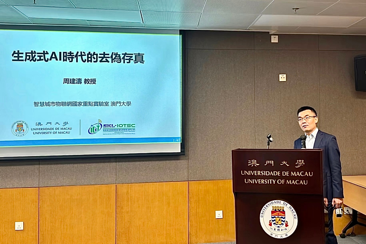 澳門大學舉行“澳大學人研究講壇”第18講,由澳大科技學院電腦及資訊科學系和智慧城市物聯網國家重點實驗室教授周建濤以“生成式AI時代的去偽存真”為題發表演說。講座現場反響熱烈,並吸引一眾中學師生於線上參與。