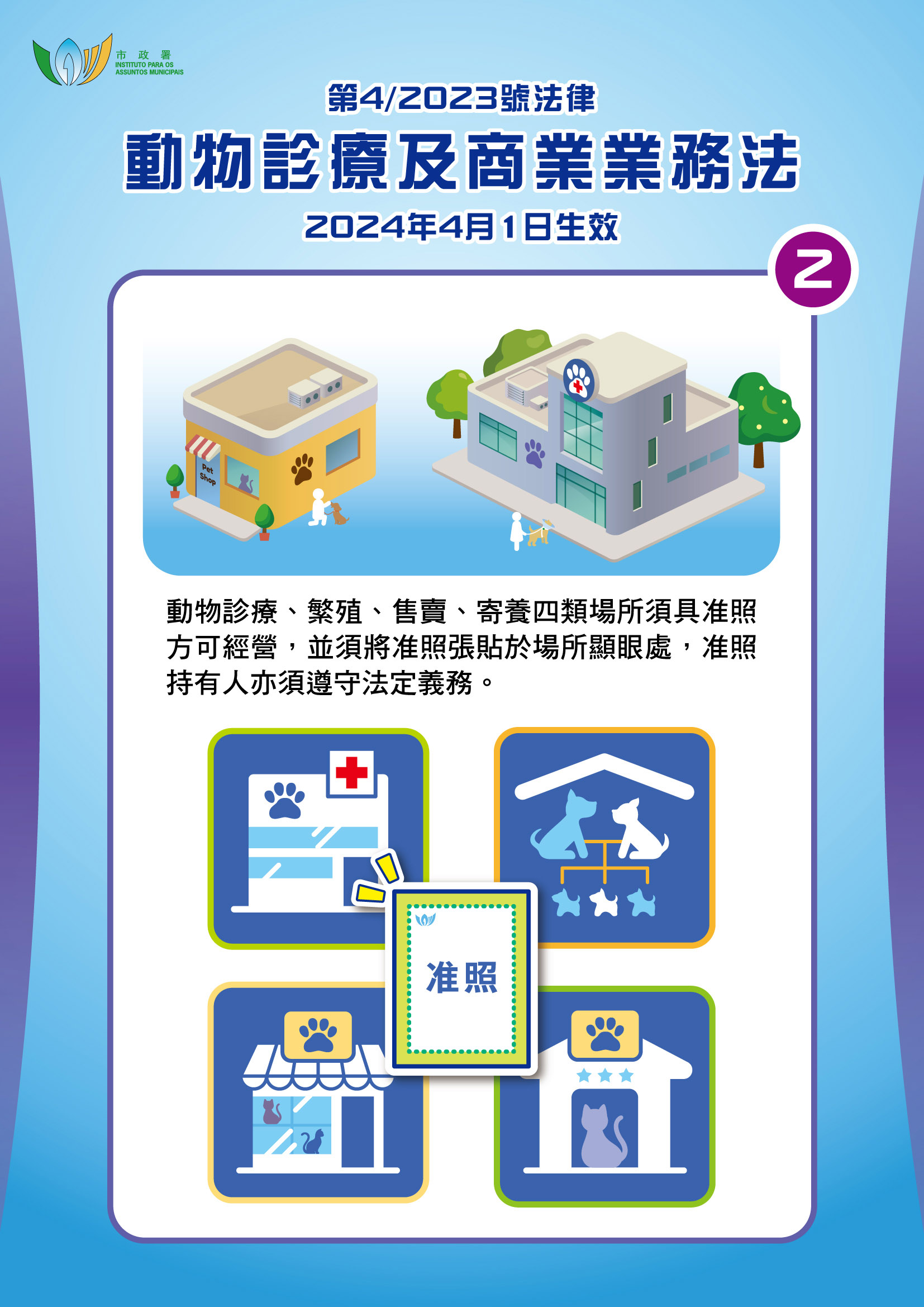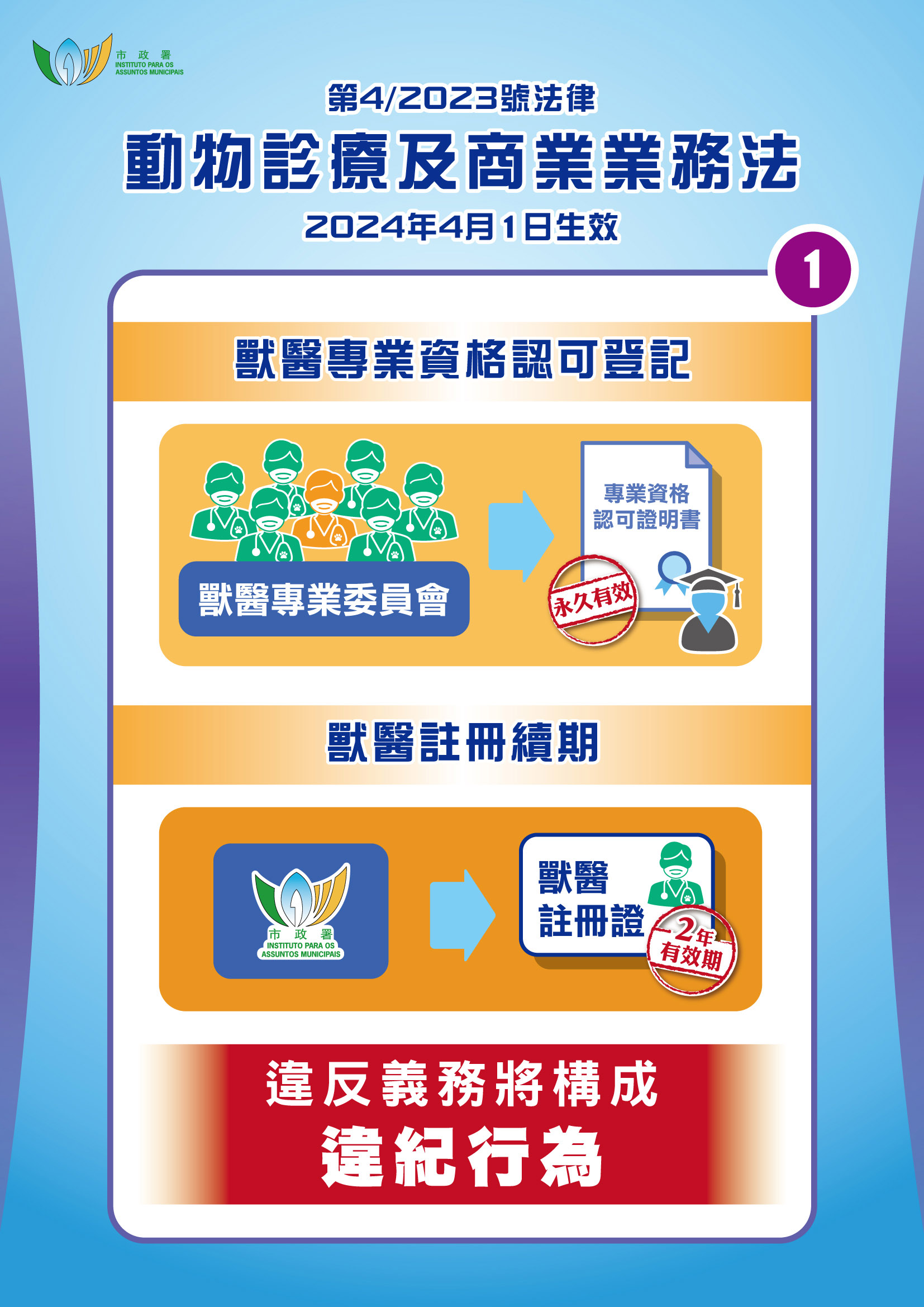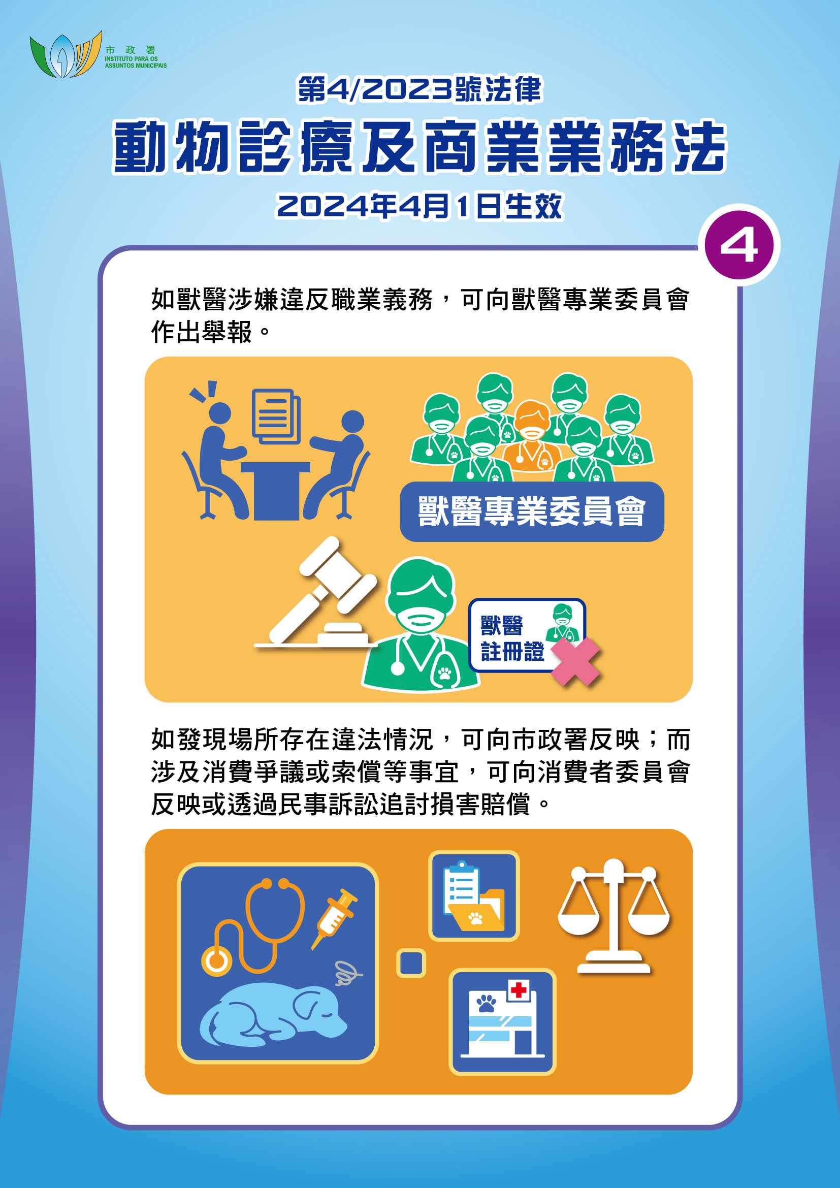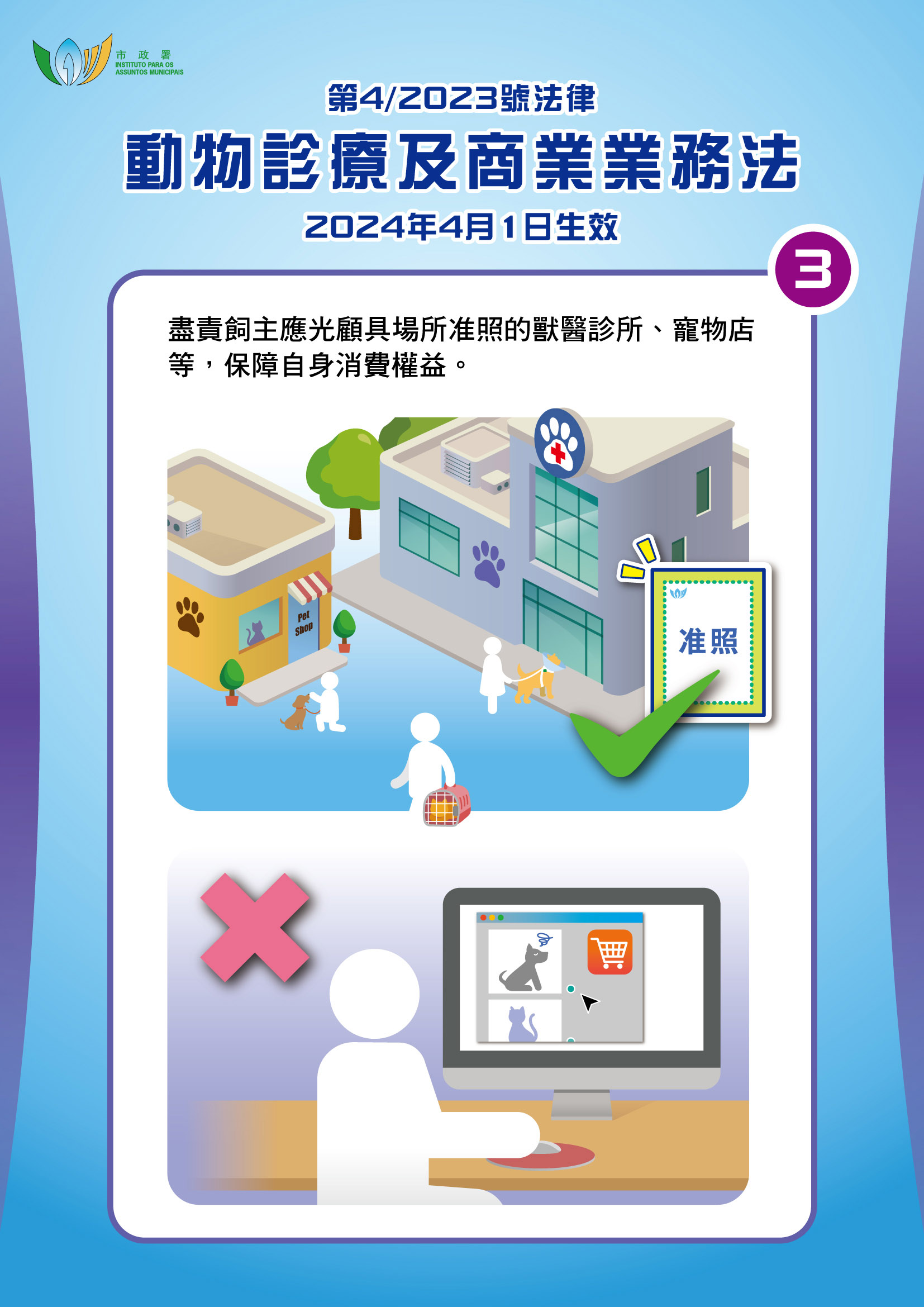 《動物診療及商業業務法》的有效落實,有助加強保護動物及維護公共衛生,進一步提升本澳動物衛生水平及整體獸醫服務質素,而飼主應光顧具場所准照的獸醫診所、寵物店等,保障自身消費權益。法律生效後,市民如發現獸醫涉嫌違反職業義務,可向獸醫專業委員會作出舉報;如懷疑有關場所存在違法情況,可向市政署反映;涉及消費爭議或索償等事宜,則可向消費者委員會反映或透過民事訴訟追討損害賠償。更多法律資訊,歡迎市民瀏覽市政署動物衛生監督網(www.iam.gov.mo/canil)或獸醫專業委員會專題網頁(www.cpmv.gov.mo)的《動物診療及商業業務法》欄目。