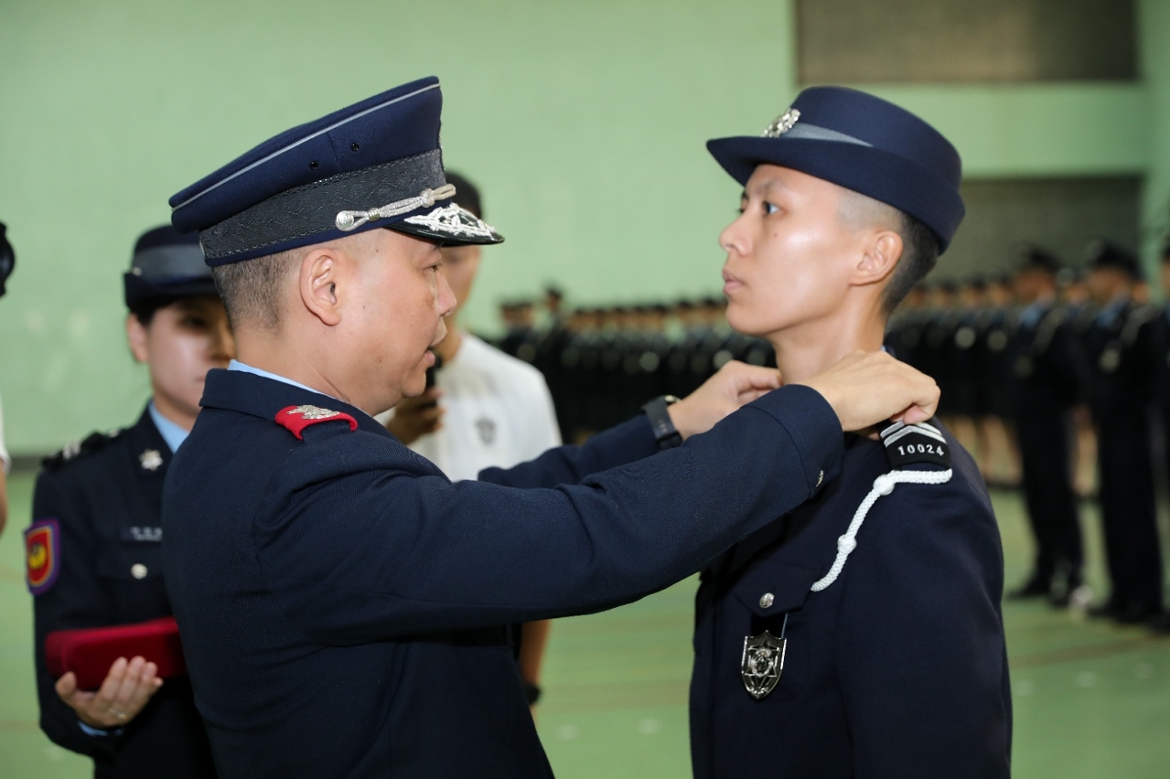 3月25日,治安警察局在特警隊大樓為新入職警員舉行就職儀式,儀式由治安警察局吳錦華局長主持,黃偉鴻副局長、梁慶康副局長、伍素萍副局長及各部門主管一同出席為新警員戴上肩章。