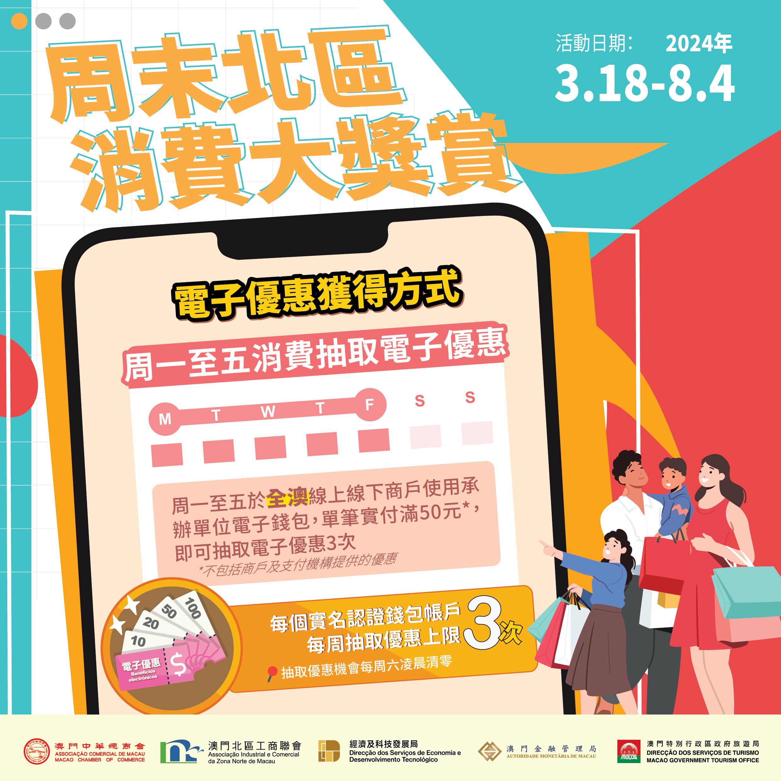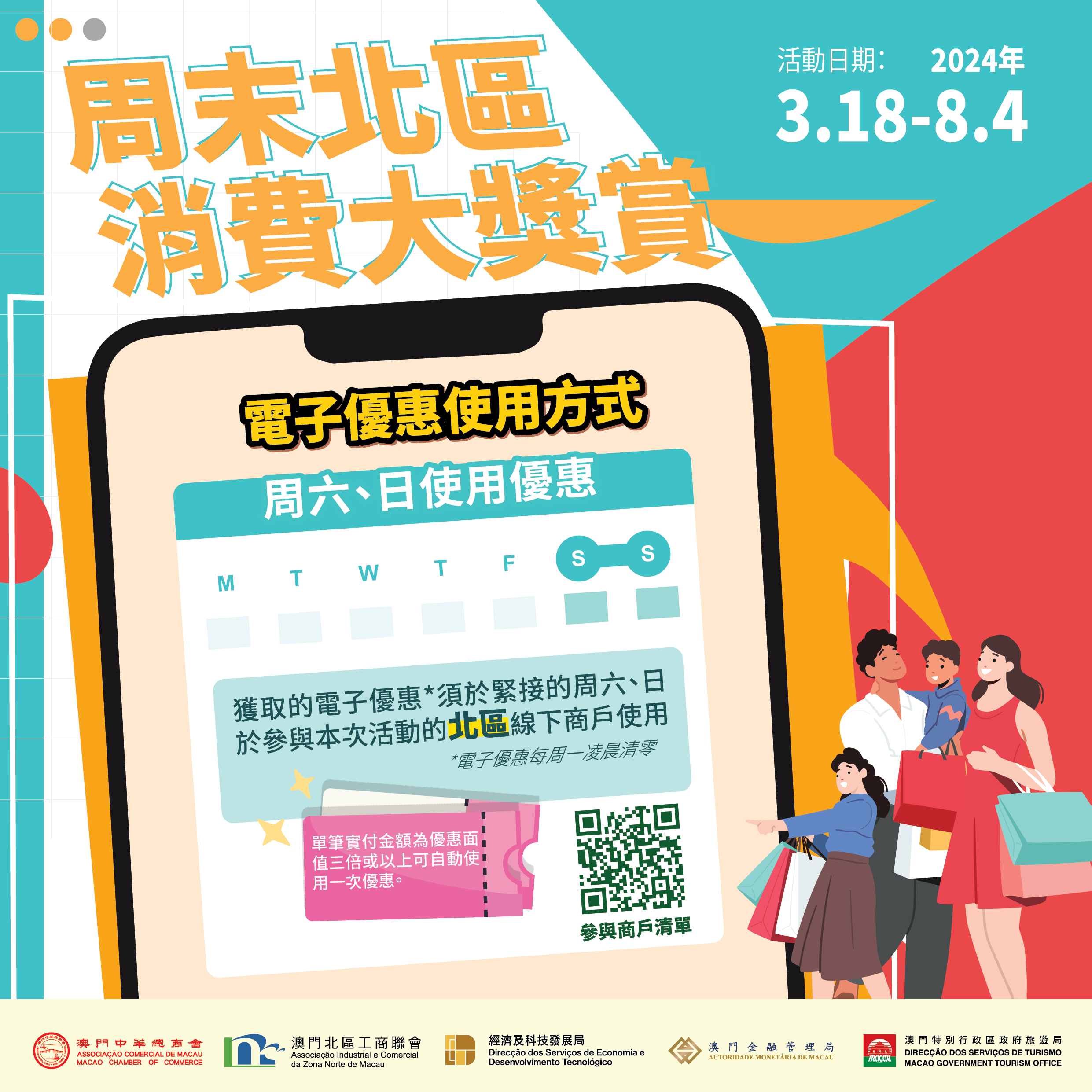 特區政府聯同澳門中華總商會、澳門北區工商聯會,於3月18日至8月4日期間合辦 “周末北區消費大奬賞”促消費活動。主辦單位期望,政府、商會及社區商戶共同努力,延續“北區消費嘉年華”成效,透過周一至五消費後送出周末北區電子消費獎賞,持續鼓勵居民在民生區消費,促進社區消費循環,從而增強中小企經營信心。