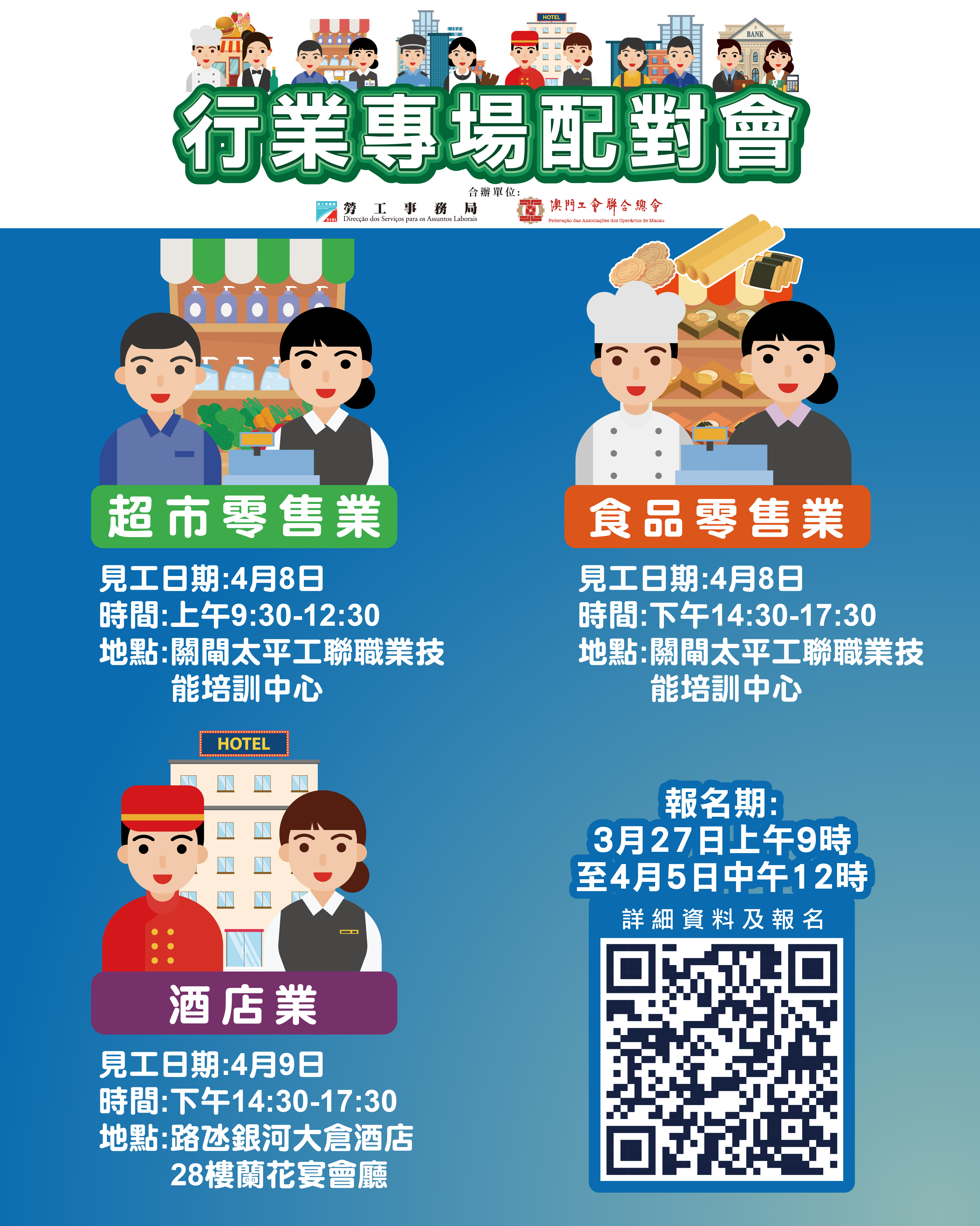 上述4月8日上午超市零售業配對會及下午食品零售業配對會在澳門工聯職業技能培訓中心(關閘馬路101-105A號太平工業大廈第一期1樓)舉行;4月9日下午酒店業配對會在澳門大倉酒店28樓舉行。報名日期為3月27日上午9時至4月5日中午12時。
