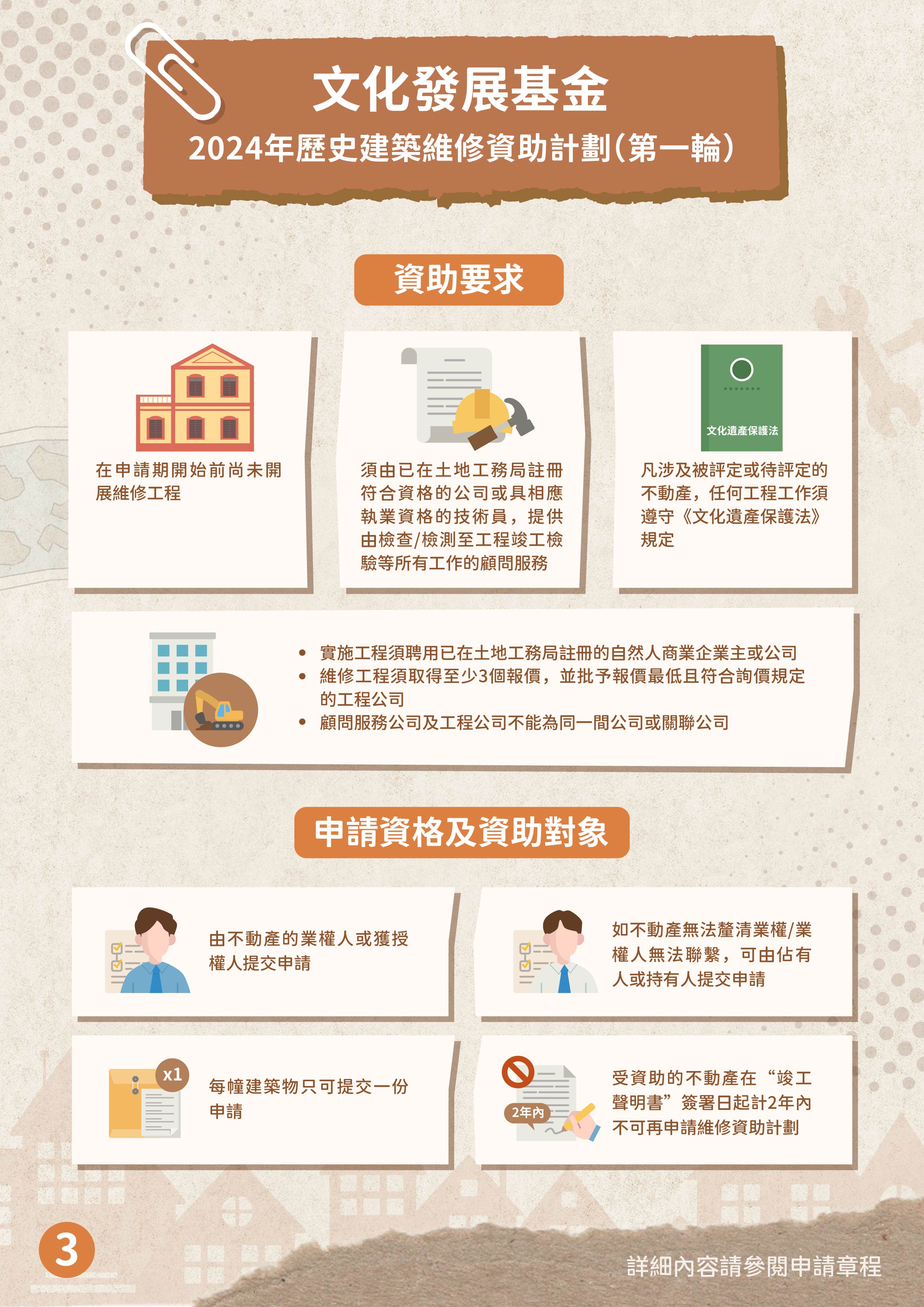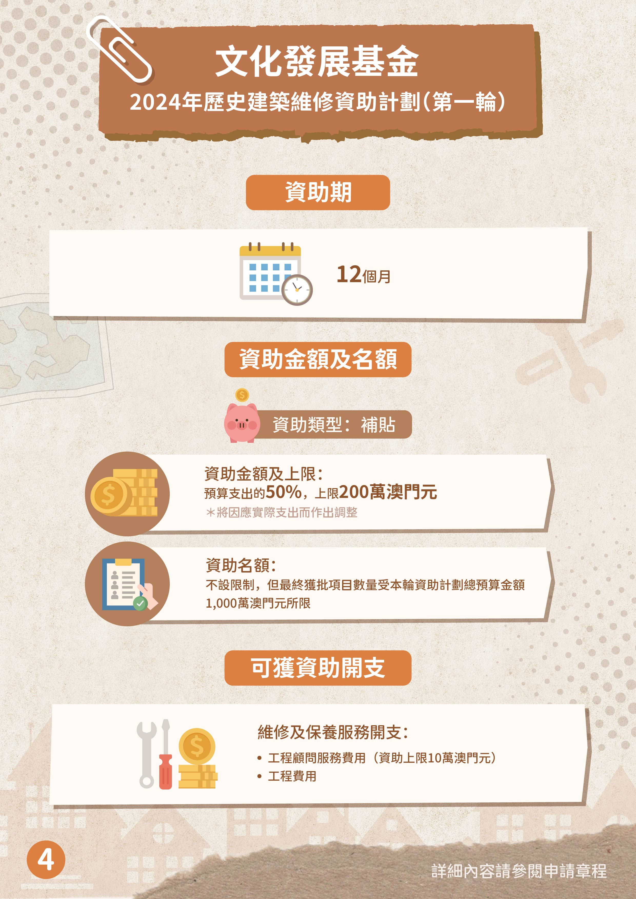 資助計劃支持業權人定期對私人文物建築和具文化價值建築開展結構檢查或檢測、實施外觀保養,以及因應檢測結果實施必要的修復及維護等工作。文化發展基金將對申請項目作資格及文件審查,並送交文化局進行技術分析,接着會交由文化遺產委員會就該申請建築物的文化價值、維修的迫切性和必要性,以及對提升社會認知和文遺保護的正面意義等因素發表意見。倘申請項目獲初步通過,基金將通知申請人提交由顧問服務公司擬定的歷史建築維修方案,後續由基金的活動和項目評審委員會就申請項目的維修工程必要性、建築物狀態的預期改善效果、預算合理性作出評分。