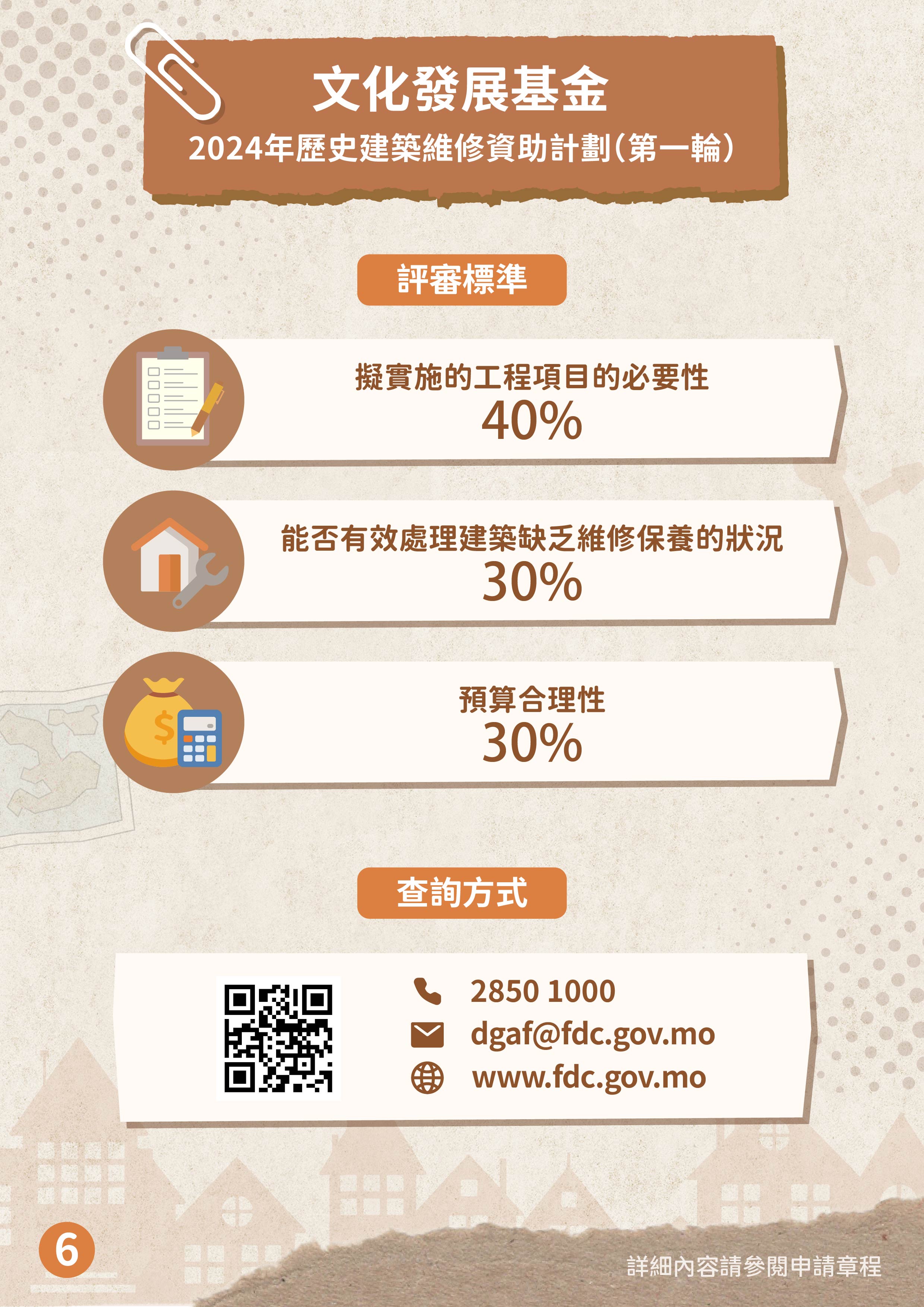 為詳細介紹“歷史建築維修資助計劃”的申請事宜及解答申請人問題,基金將於4月10日下午3時假誠豐商業中心7樓演講廳(地址:澳門宋玉生廣場322-362號)舉行專場講解會,有興趣人士請到基金網站(www.fdc.gov.mo)“電子服務及資訊下載區”的“報名登記系統”內報名,查詢請致電8985 0834或電郵dgaf@fdc.gov.mo。