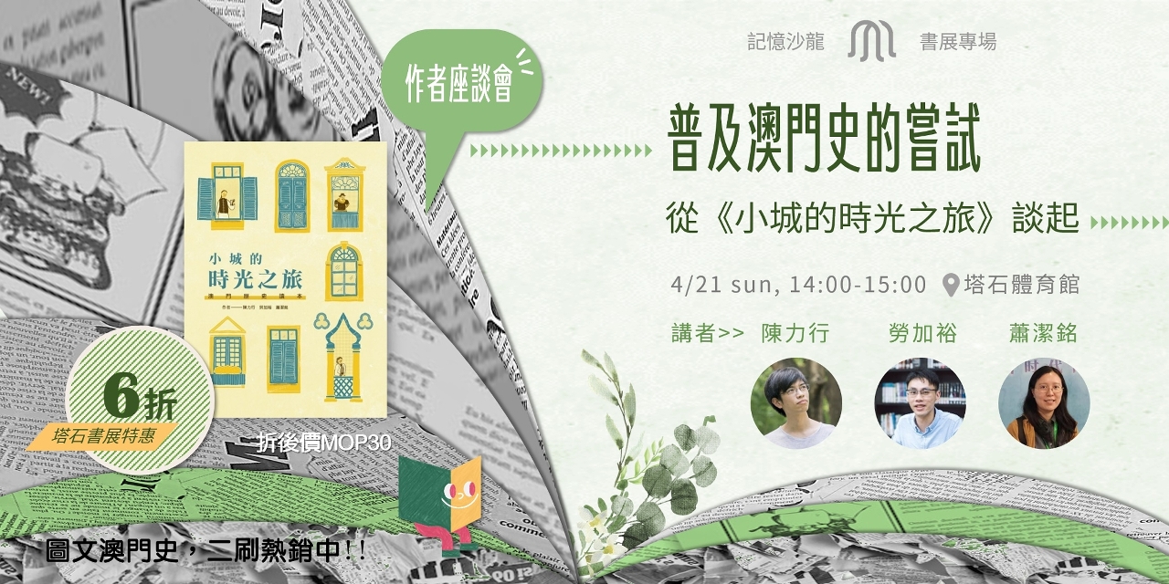 《澳門歷史讀本:小城的時光之旅》由澳門基金會與澳門歷史教育學會聯合出版,作者是青年學者陳力行、勞加裕及蕭潔銘。本書以簡明的語言與精美插畫,勾勒石器時代到抗日戰爭這四百多年的澳門歷史,出版以來獲各界歡迎,現已加印第二版。本書三位作者皆長年致力於澳門歷史知識的普及工作,藉再版的機會,於書展舉辦座談會“普及澳門史的嘗試——從《小城的時光之旅》談起”,分享在成書過程中遇到的各種挑戰,和他們對普及澳門史的看法。座談會將於4月21日(星期日)下午2:00-3:00於塔石體育館書展講座區舉行,名額有限,先到先得,歡迎市民踴躍參與。查詢或留座可電郵至MacauMemory@fm.org.mo。