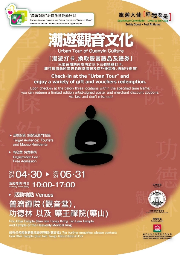 “潮遊觀音文化”於4月30日至5月31日上午10時至下午5時帶來以觀音文化為主題的深度遊覽體驗,通過微信小程式以中、英文介紹普濟禪院(觀音堂)、功德林和藥王禪院(藥山),其中在普濟禪院及功德林更安排駐場導賞員作中、英文介紹。此外,在限期內成功於上述三個地點打卡,即可換取藝術家簽名限量海報及商戶優惠券。活動通過線上引流、線下遊覽打卡以及聯動社區中小微企業消費的方式,讓旅客和居民深入瞭解澳門佛教文化及普濟禪院、功德林和藥王禪院的歷史故事與建築風格特色,感受澳門的多元文化共融。
