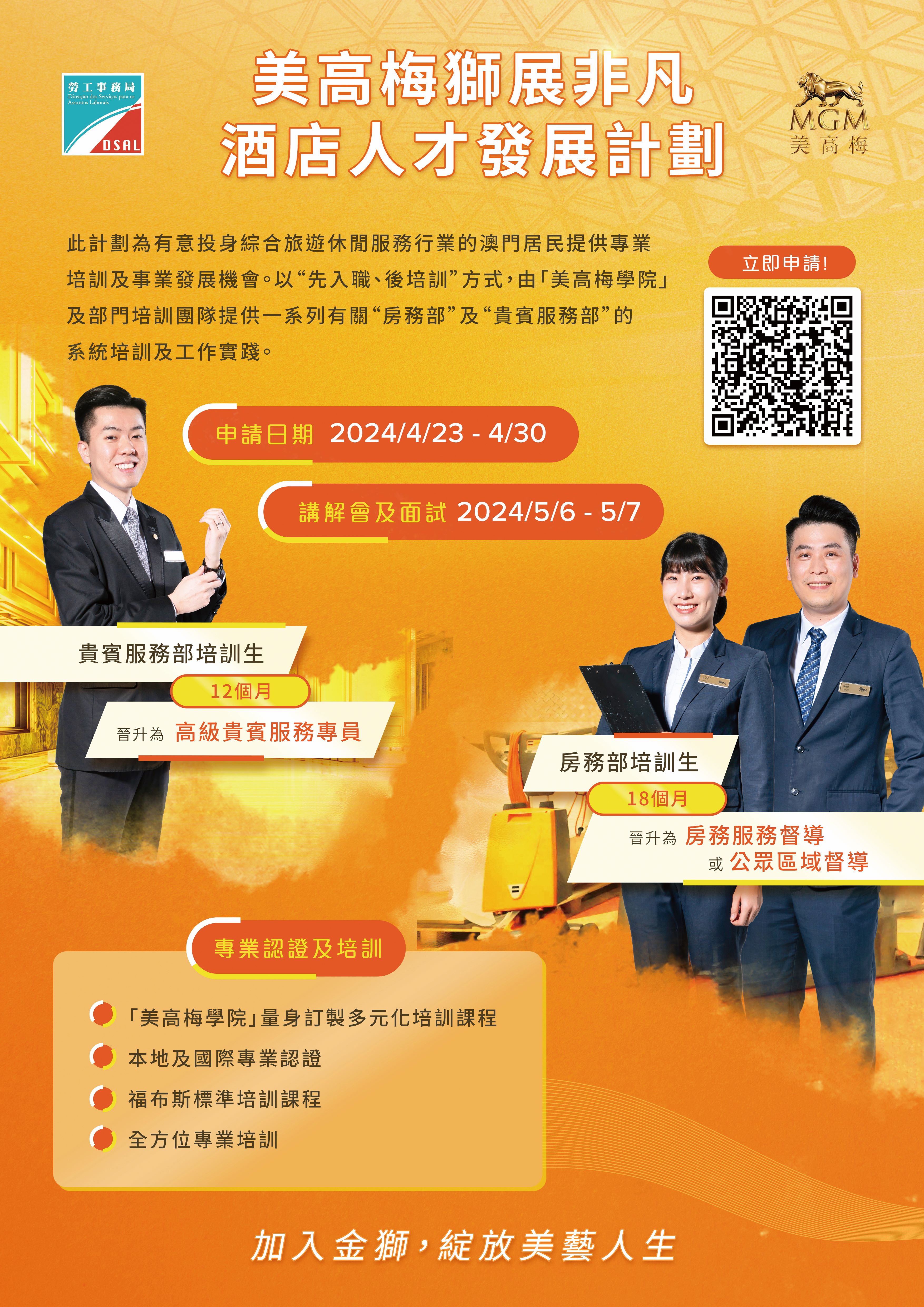 為進一步培育本地人才並提供發展階梯,勞工事務局和美高梅金殿超濠股份有限公司(下稱“美高梅")合作推出“美高梅獅展非凡酒店人才發展計劃"(下稱“計劃"),以“先入職、後培訓”方式,為有志投身綜合休閒旅遊服務行業的澳門居民提供全方位培訓及發展階梯,計劃由4月23日起接受申請。