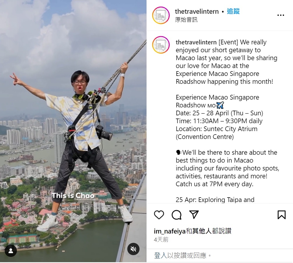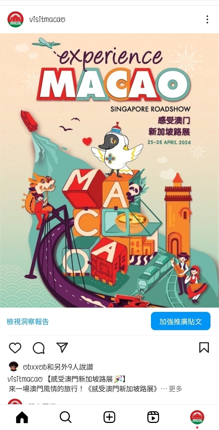 旅遊局已在當地有序鋪開一連串預熱推廣新加坡大型路展,包括:設立活動專頁 https://www.macaotourism.gov.mo/zh-hant/article/promotion/experience-macao-singapore-roadshow;自4月初起在新加坡旅遊達人The Travel Intern旗下多個平台進行宣傳;本週起加強在新加坡電台、報紙、廣告燈箱、購物中心外牆大型電子屏幕以及旅遊局多個官方社交平台發放活動資訊,疊加多位網紅的推廣,擴大活動曝光度,冀吸引當地居民到活動現場體驗澳門“旅遊+”,帶動新加坡乃至東南亞的潛在客源來澳旅遊,進一步拓展澳門國際客源市場。