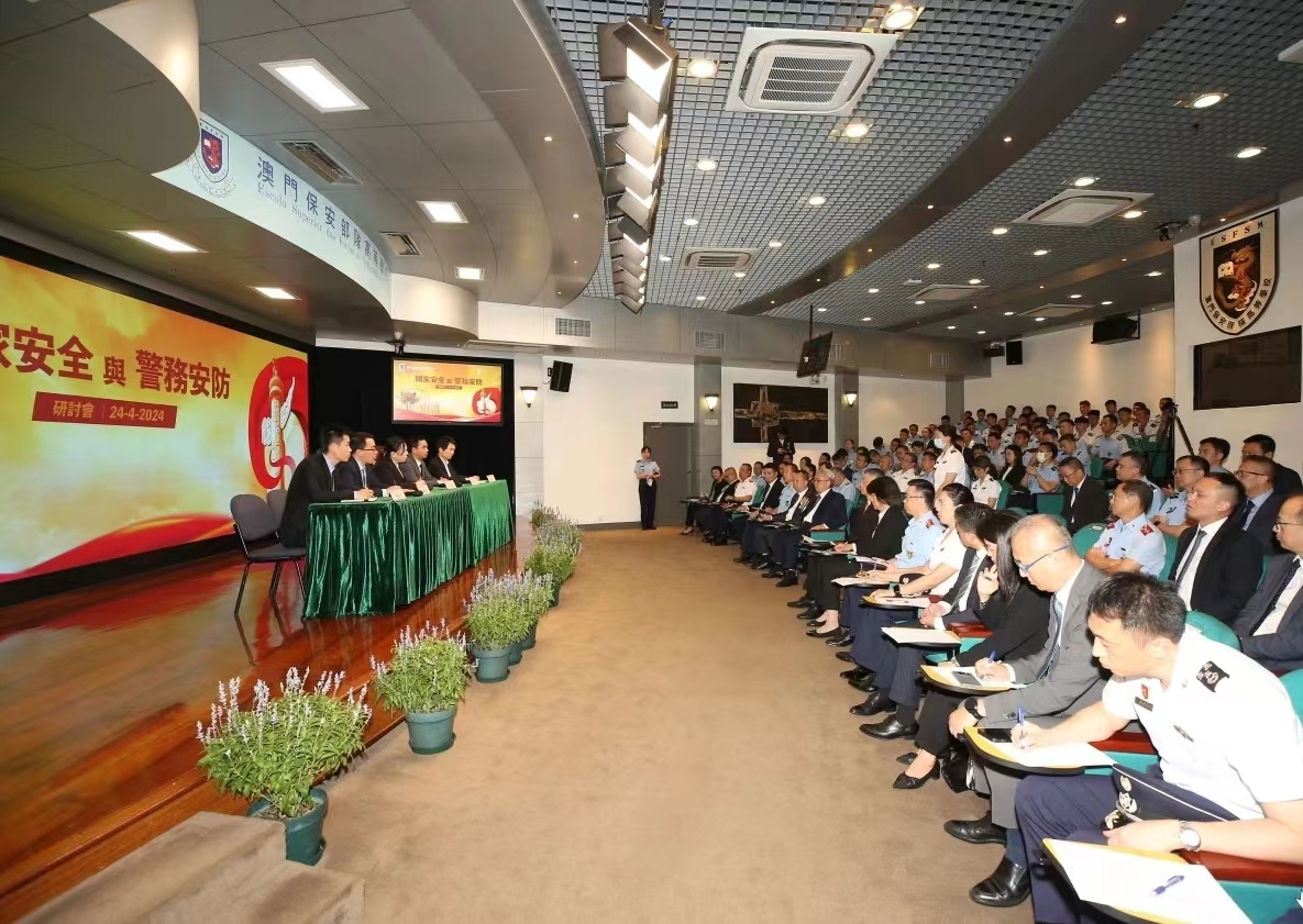 為築牢國家安全防線,進一步增強人員維護國家安全的意識和責任。於4月24日,澳門保安部隊高等學校(下稱“保安高校”)舉辦“國家安全與警務安防”研討會,研討會的開幕式由保安司司長黃少澤、警察總局局長梁文昌、澳門海關關長黃文忠和香港警務處助理處長王忠巡等主禮。來自中國人民公安大學、中國人民警察大學、中國刑事警察學院、廣東警官學院和香港警務處的專家學者在研討會中分享真知灼見和研究成果,為夯實國家安全作出貢獻。研討會除在校內舉辦外,亦在各保安部隊及保安部門設線上直播點,總參與人數共約440人。