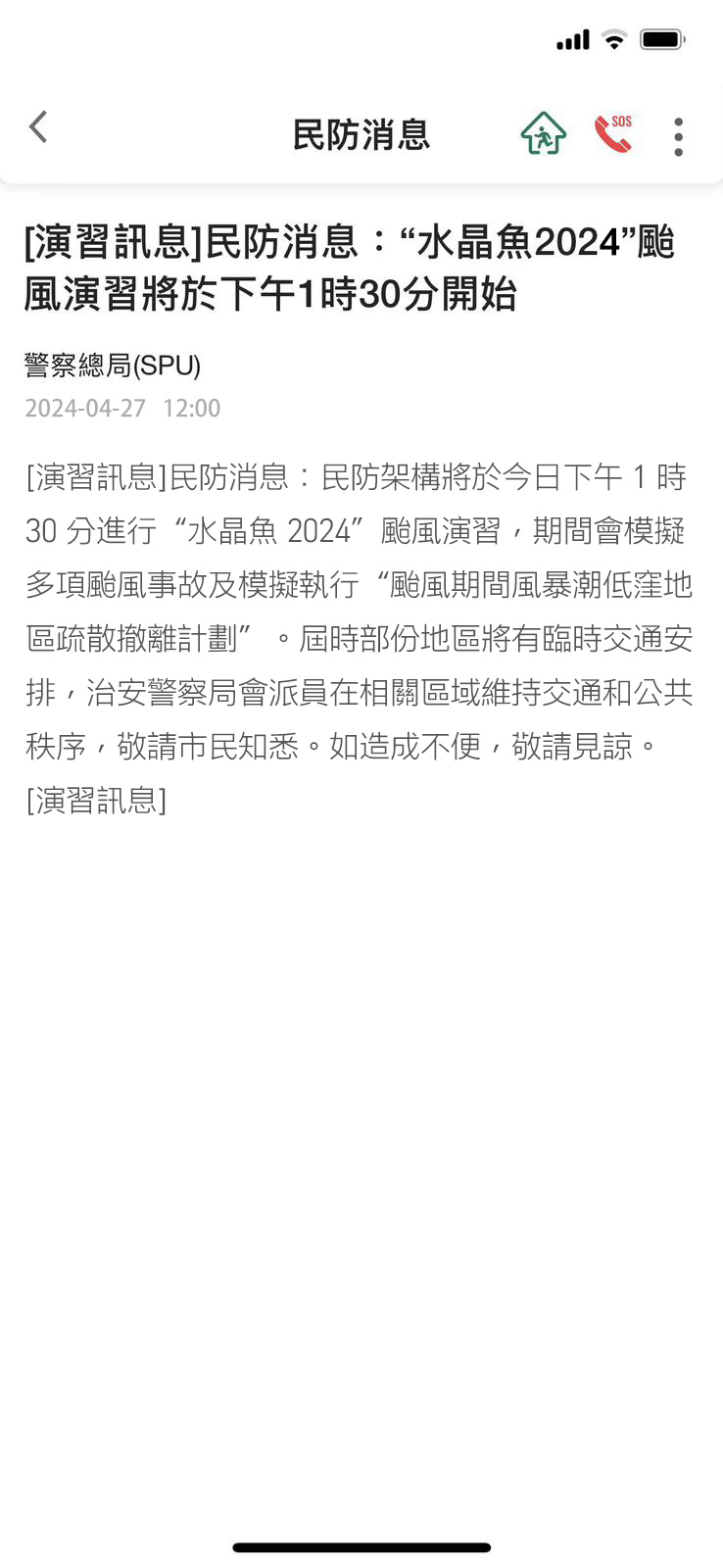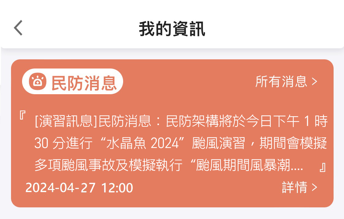 為共同應對本年度的颱風及風暴潮並作充足準備,“水晶魚2024”民防演習將於4月27日舉行,屆時,“一戶通”將配合推送相關演習訊息。