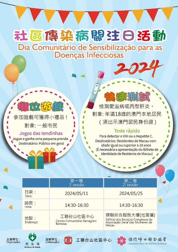 為提高大眾對預防傳染病的意識,衛生局將分別於5月11日和25日下午2時30分至4時30分與澳門工會聯合總會和澳門婦女聯合總會合作舉辦“社區傳染病關注日活動",活動詳情請參閱海報,歡迎居民踴躍參加。 是次活動透過攤位遊戲的形式宣傳預防傳染病,包括愛滋病、乙型肝炎、丙型肝炎、手足口病、登革熱及恙蟲病等,活動對象為一般居民,完成指定遊戲項目後可獲得小禮品。