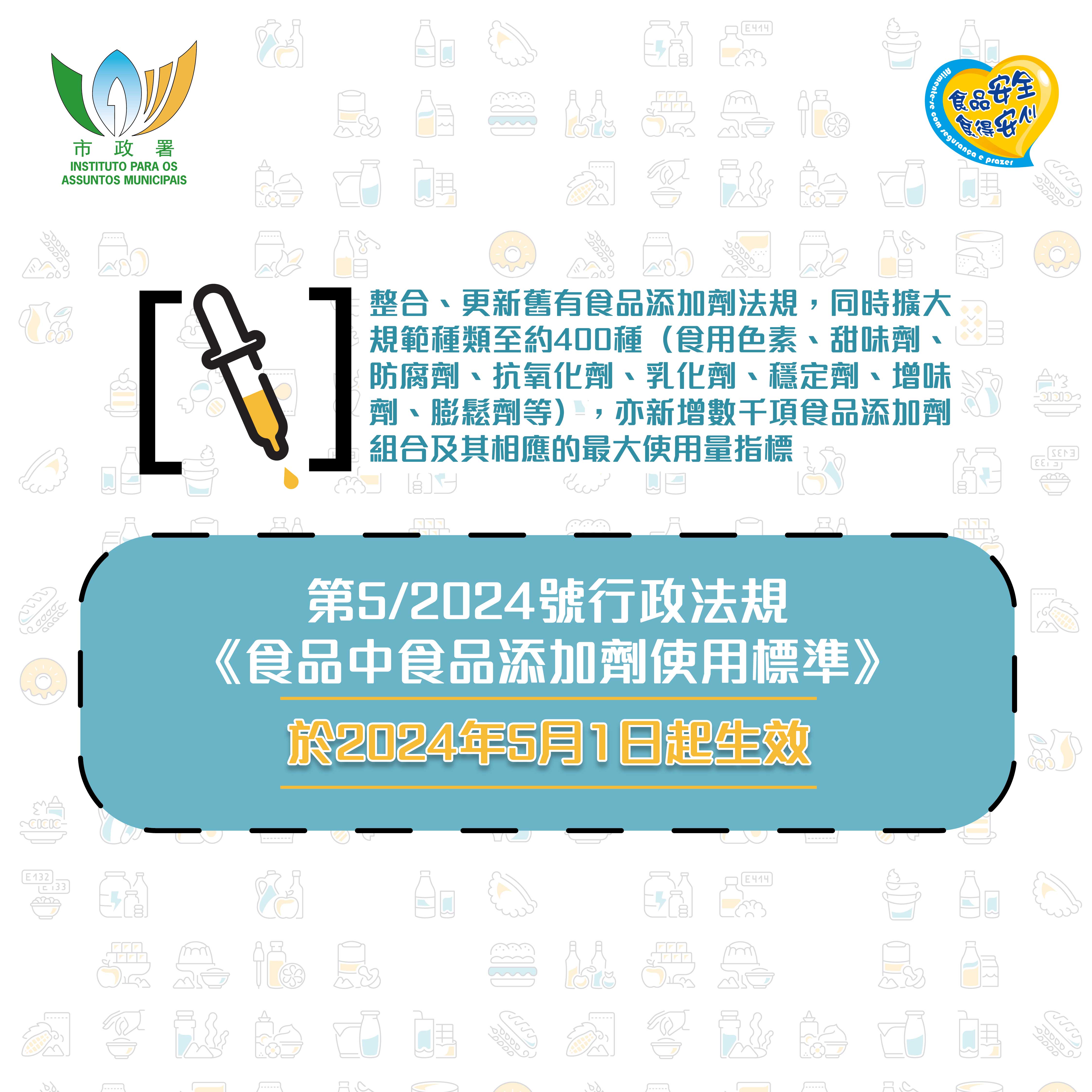 第5/2024號行政法規《食品中食品添加劑使用標準》於今年五月一日起生效,除整合及更新舊有的食品添加劑使用標準,亦擴大規範種類及範圍,進一步保障本澳食品安全。市政署將持續進行常規食品抽檢及日常食安巡查,一旦發現檢測結果不符食安標準,或生產經營違反《食品安全法》,將依法跟進處理。