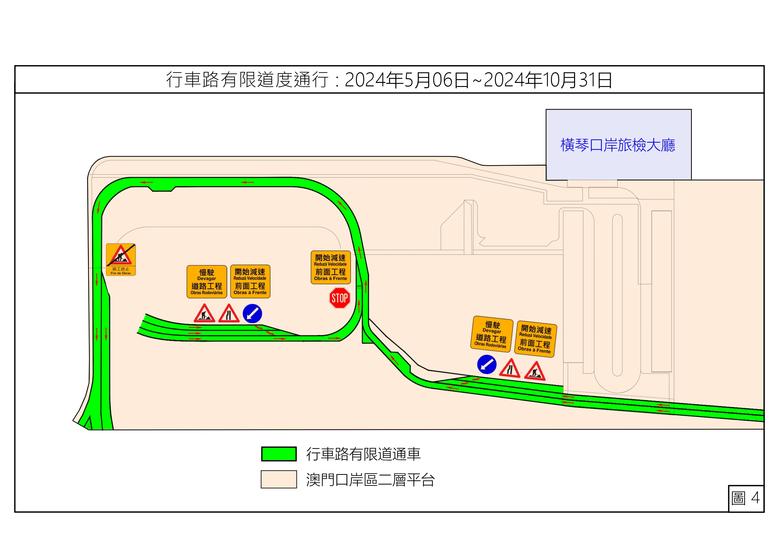 3. 由5月6日起至10月31日,車輛離開橫琴口岸前往路氹城區之車道將實施單線有限度通車,詳細改道情況見圖4,請駕駛者留意現場交通指示標誌或遵守現場交通警員的指揮及安排。