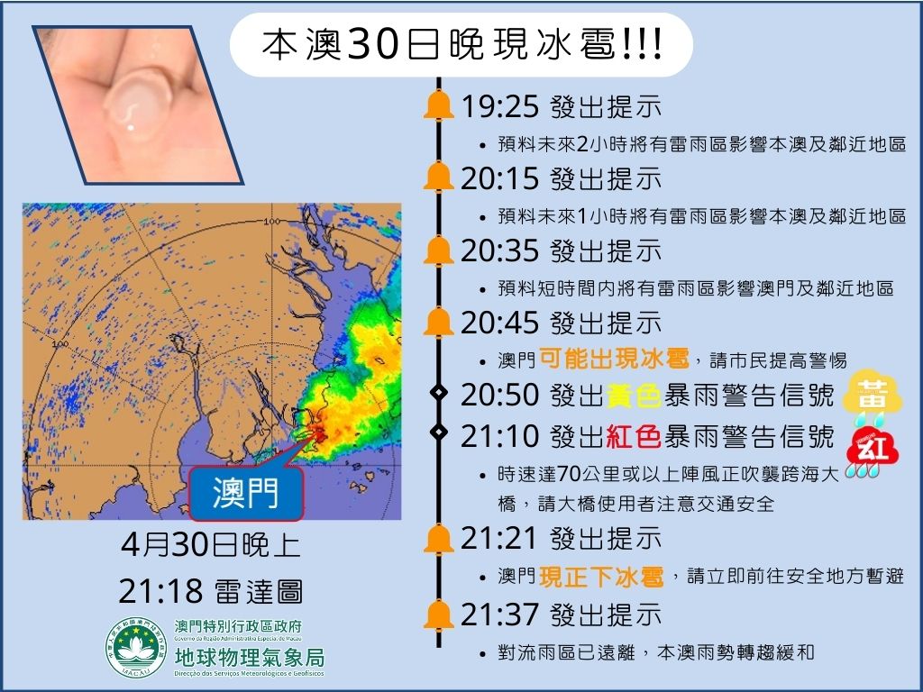 受一道低壓槽影響,本澳30日晚間出現強對流天氣。氣象局於19:25開始發出特別消息,及於20:45發出冰雹預警信息,再先後發出黃色及紅色暴雨警告信號。期間,除了出現短時強降雨及強烈陣風外,於21:20前後,本澳多個地區更錄得冰雹!! 是本澳自2011年(於澳門國際機場錄得)以來,再次錄得同類現象。