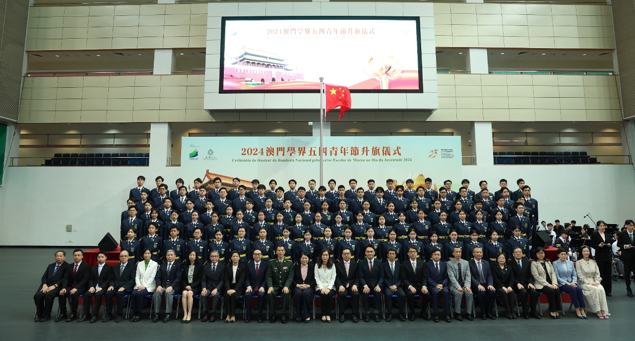 “澳門學界五四青年節升旗儀式”於2024年5月4日早上在澳門理工大學體育館舉行。儀式進行前,現場播放了59個校部以壁報、書法及繪畫作品,表達傳承五四精神、齊賀雙慶的喜悅。接着,澳門青年管樂團演奏國歌,五星紅旗在澳門學界升旗隊旗手的拉動下冉冉升起。在鏡平中學、教業中學、聖公會(澳門)蔡高中學、中葡職業技術學校及鮑思高粵華小學5所學校合唱團的帶領下,全體人員高唱國歌,場內響徹宏亮的歌聲,洋溢高漲的愛國之情。司儀介紹了五四運動的由來後,分別由澳門演藝學院學生呈獻結合舞蹈、音樂和朗誦的《五四,我們的節日》表演,勞校中學獻上武術表演《龍騰虎躍武動少年》及澳門坊眾學校獻上舞蹈表演《我們看見了鴻雁》。另外,現場亦播放澳門學界升旗隊成立五周年短片,記錄了隊員在中國人民解放軍駐澳門部隊軍官的指導下,五年以來的進步與成長,成為可獨當一面執行任務的升旗隊員。最後,澳門學界升旗隊及學校合唱團合唱《七子之歌》,以洪亮的歌聲莊嚴地表達愛國之情。
