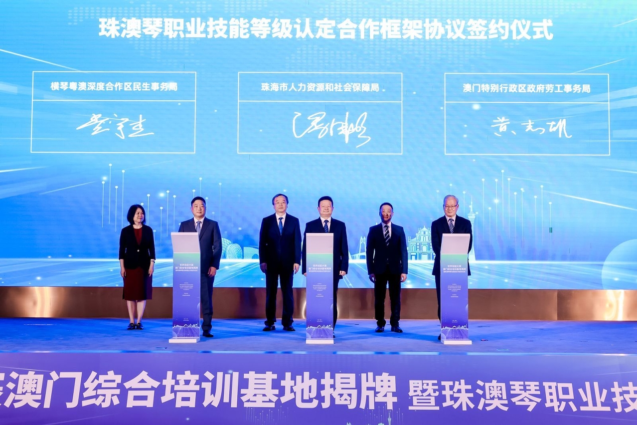 活動上,珠海市人社局、澳門勞工事務局、橫琴合作區民生事務局簽署了《珠澳琴職業技能等級認定合作框架協議》,開啟珠澳琴三方技能人才工作全領域合作新篇章。該協議明確將充分發揮三方在技能人才工作方面的優勢,建立長期穩定、互惠互利的合作關係,堅持“立足灣區、資源分享、優勢互補、合作共贏、共謀發展”的原則,全面開展技能人才培訓、實訓、競賽、評價、交流等各領域深度合作,促進三地技能人才精準培養、互通互認。同時三方將以聯盟為平台開展全鏈條、全要素、全時空交流合作,通過“送教入澳” 、“請澳來珠” 、“送考到琴” 、“聯合辦賽” 、“一試多證”等多種方式,實現三方技能人才工作“標準共用、評價互認、供求匹配、深度融合”。