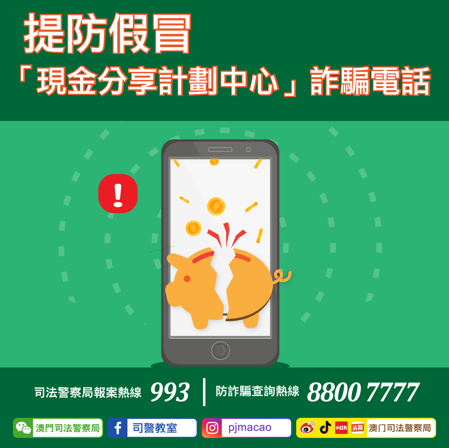 司警局反詐騙協調中心提醒廣大市民,不明來電應果斷拒絕並立即掛線,切勿輕信任何自稱官方機構的來電,若有懷疑,應循官方途徑查詢核實。如接獲任何懷疑詐騙電話,可使用司警局“反詐程式”查詢風險指數或上報資料,又或致電司警局防詐騙查詢熱線88007777及報案熱線993求助。