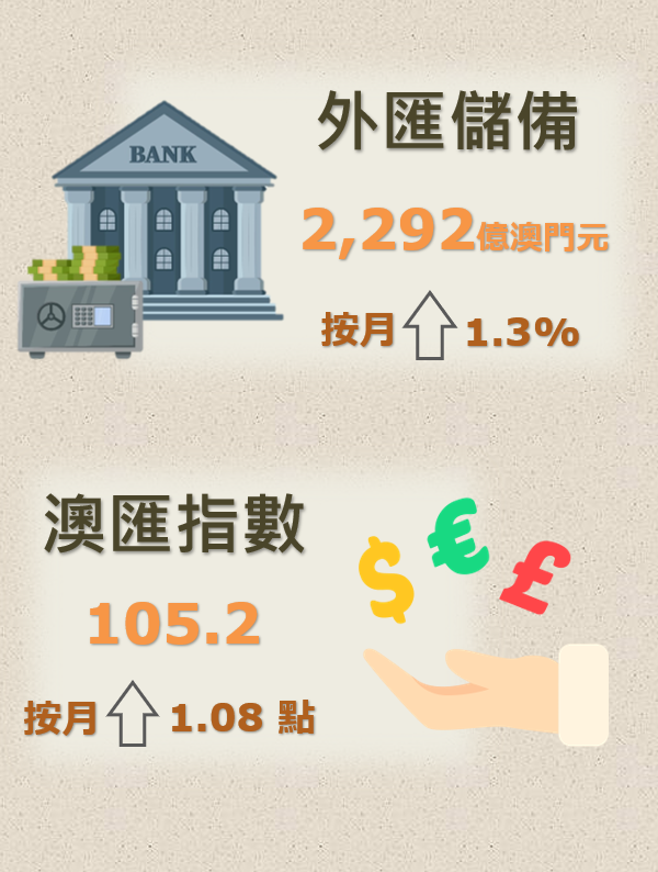 澳門金融管理局今(14)日公佈,2024年4月底澳門特別行政區的外匯儲備資產總額,初步統計為2,292億澳門元(284.4億美元),較2024年3月經修訂總額2,262億澳門元(280.7億美元),上升了1.3%。2024年4月底的外匯資產總額,約相當於2024年3月底澳門流通貨幣的11倍或廣義貨幣供應(M2)中屬於澳門元部分的91.1%。