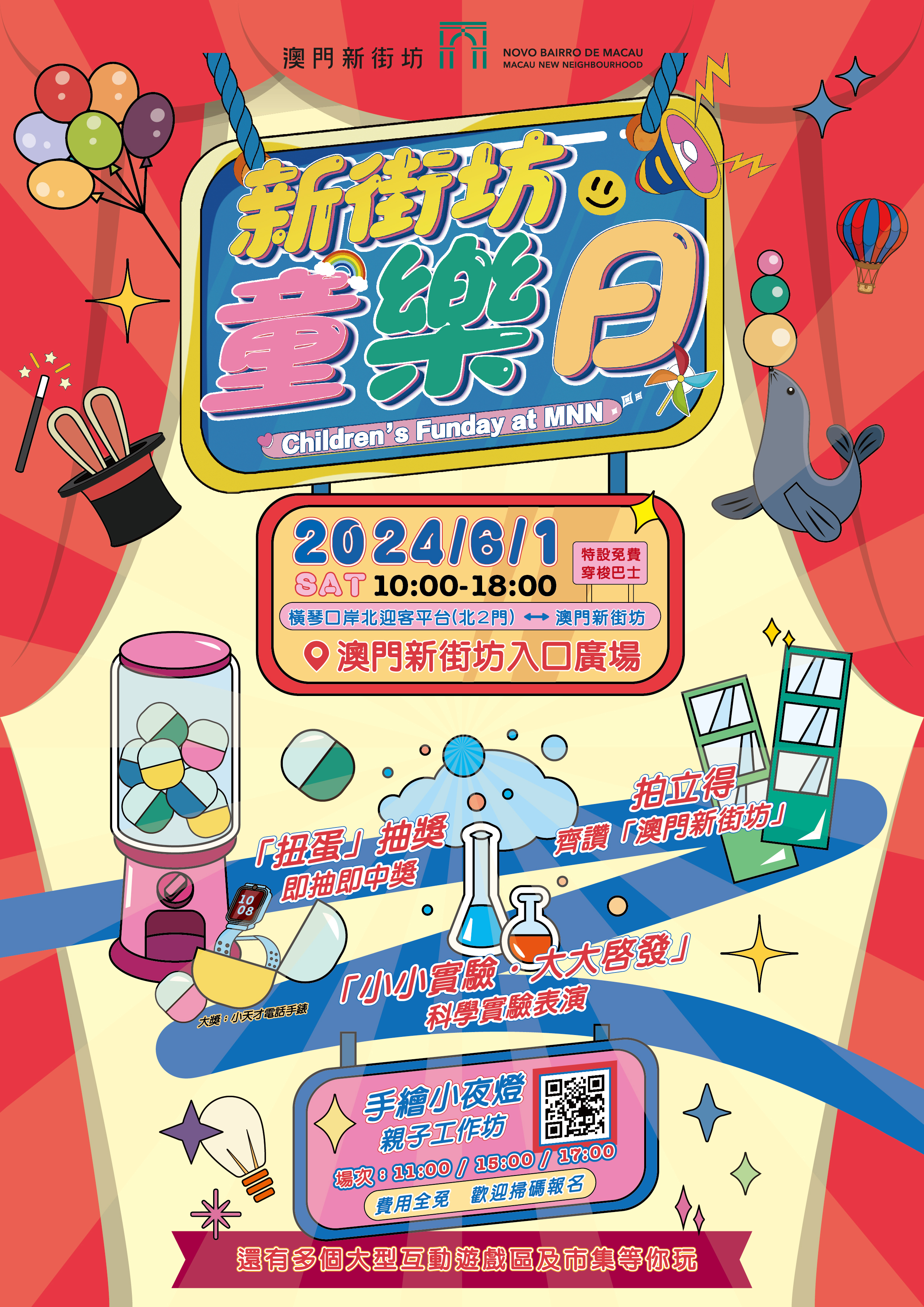 為慶祝國際兒童節,橫琴「澳門新街坊」將於6月1日(周六)上午十時到下午六時舉辦「新街坊‧童樂日」,現場設有豐富節目,包括拍立得打卡位、多個大型互動遊戲區、樂隊演出、科學實驗表演、手繪小夜燈親子工作坊以及市集等,鼓勵兒童寓學習於娛樂,歡迎市民齊聚澳門新街坊享受親子時光。