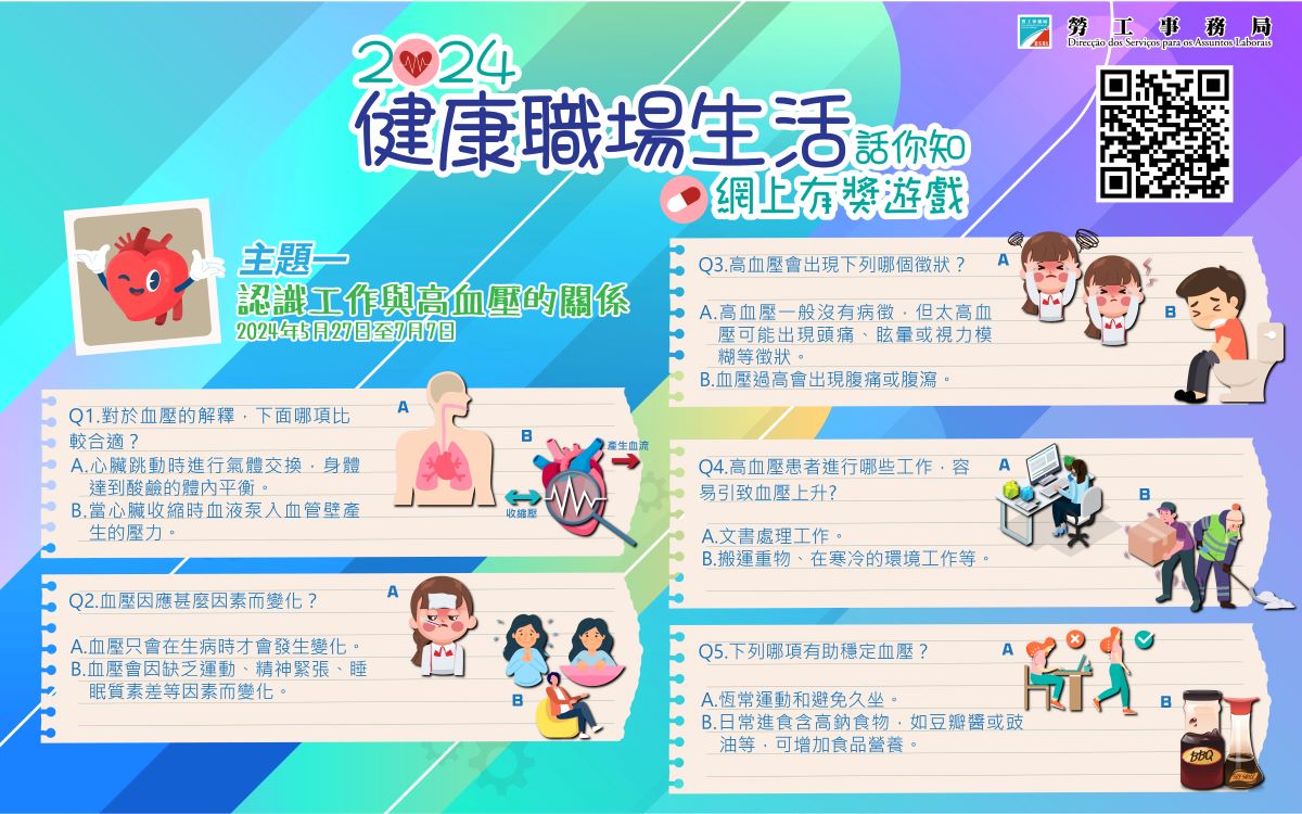 為提升市民對職業健康的關注,勞工事務局持續舉辦以職業健康為主題的“健康職場生活話你知”有獎遊戲,希望透過有獎遊戲活動,推動市民對職業健康有更多的認識。第一期遊戲舉行日期由5月27日起至7月7日,歡迎市民踴躍參加。
