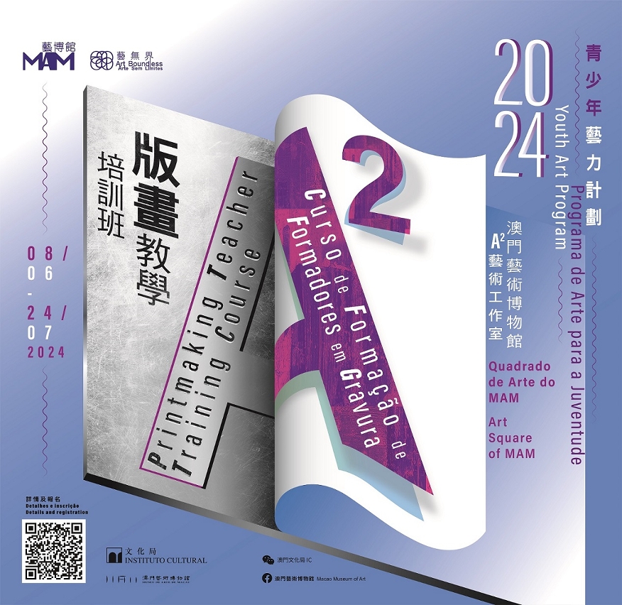 “版畫教學培訓班”兩班名額合共30名,上課日期由6月8日至7月24日,每周3節,共20節,上課地點︰A²藝術工作室(冼星海大馬路澳門回歸賀禮陳列館零層)。活動適合20歲或以上具有視覺藝術教學經驗之澳門居民,有興趣人士可於即日至5月30日透過一戶通的“活動報名”(activity.mo.gov.mo/activity-h5)進行登記,面試錄取,學費全免,自備耗材。詳情可瀏覽藝博館網頁 www.MAM.gov.mo 及臉書專頁“澳門藝術博物館 Macao Museum of Art”。