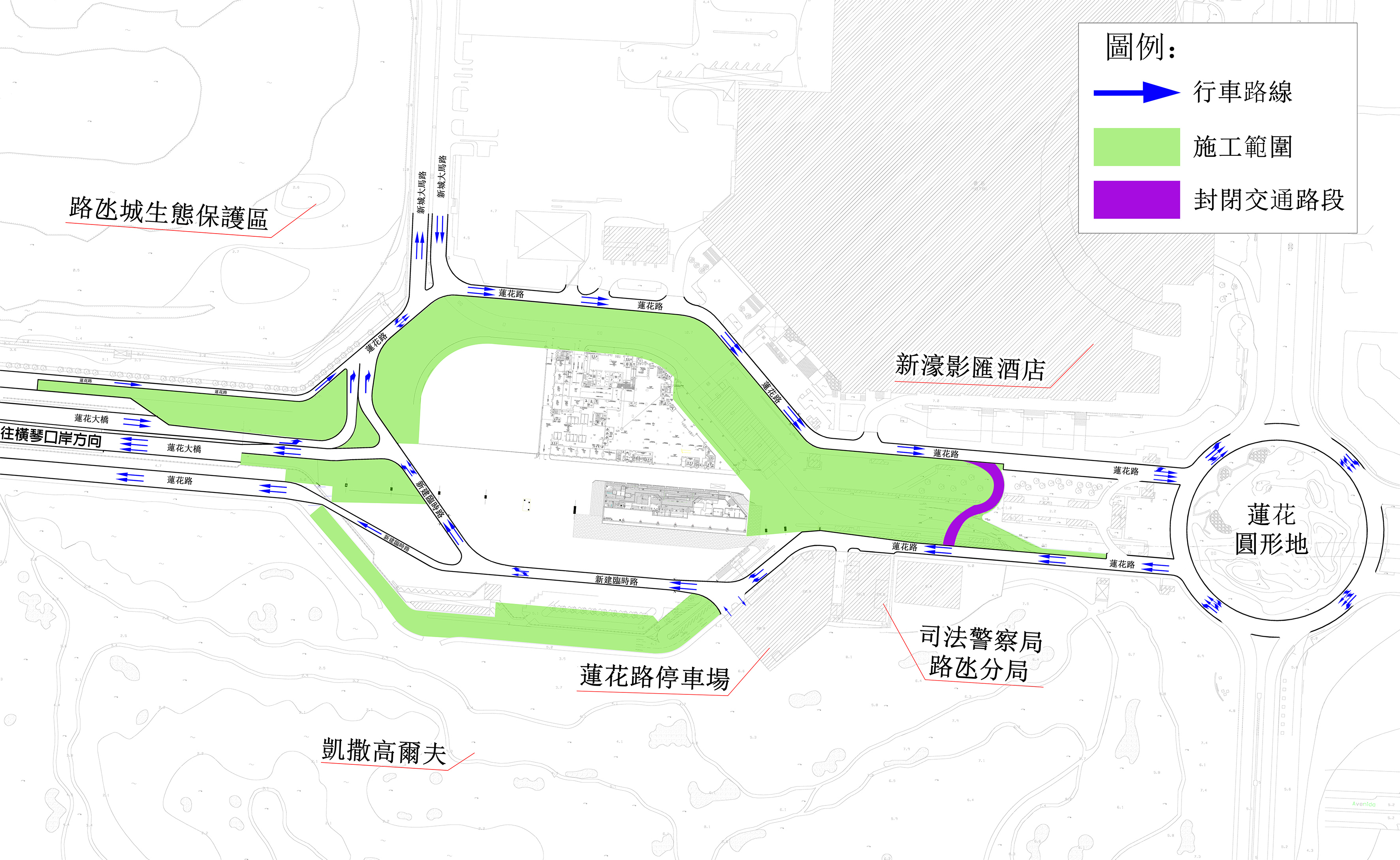 配合公共建設局於路氹蓮花路開展道路及下水道重整工程,於5月30日至7月6日期間,蓮花路近司法警察局路氹分局之中央調頭車道實施封閉交通,現行之臨時巴士措施維持不變。