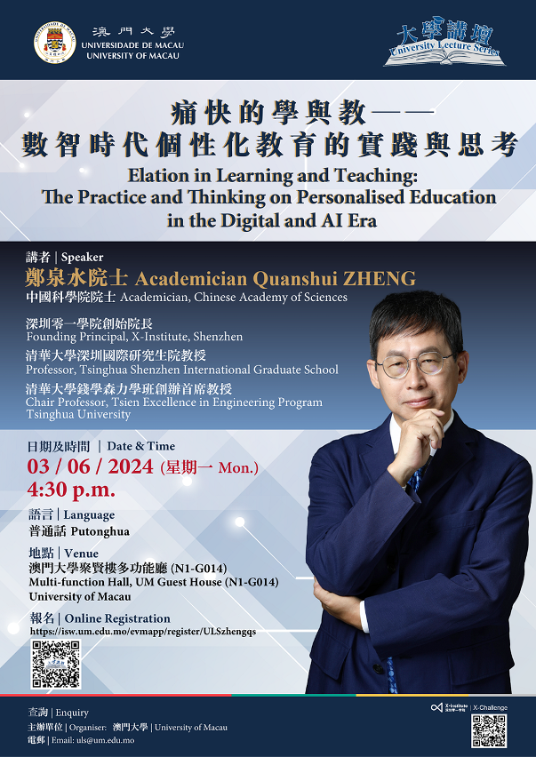 澳門大學將於6月3日(星期一)舉辦大學講壇之“痛快的學與教——數智時代個性化教育的實踐與思考”講座,邀請中國科學院院士、清華大學錢學森力學班創辦首席教授鄭泉水分享多年創新人才培養的實踐經驗。歡迎有興趣人士參加。