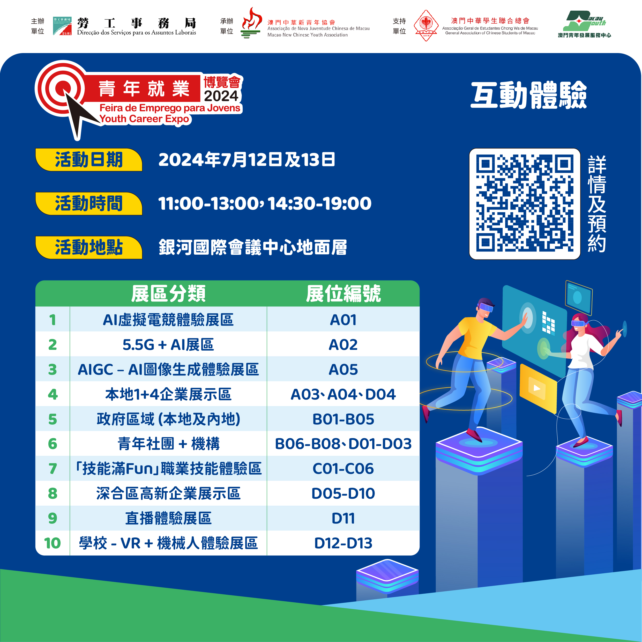 “青年就業博覽會 2024”由勞工事務局主辦,澳門中華新青年協會承辦並由澳門中華學生聯合總會及澳門青年發展服務中心支持,定於7月12日至13日假銀河國際會議中心舉行。今年主題為“展·未來新視界、探·就業新動向”,活動內容豐富,博覽會期間場館內設多項活動,包括有論壇、“1+4”行業講座、互動體驗展區等服務,明(2日)起網上接受預約進場。
