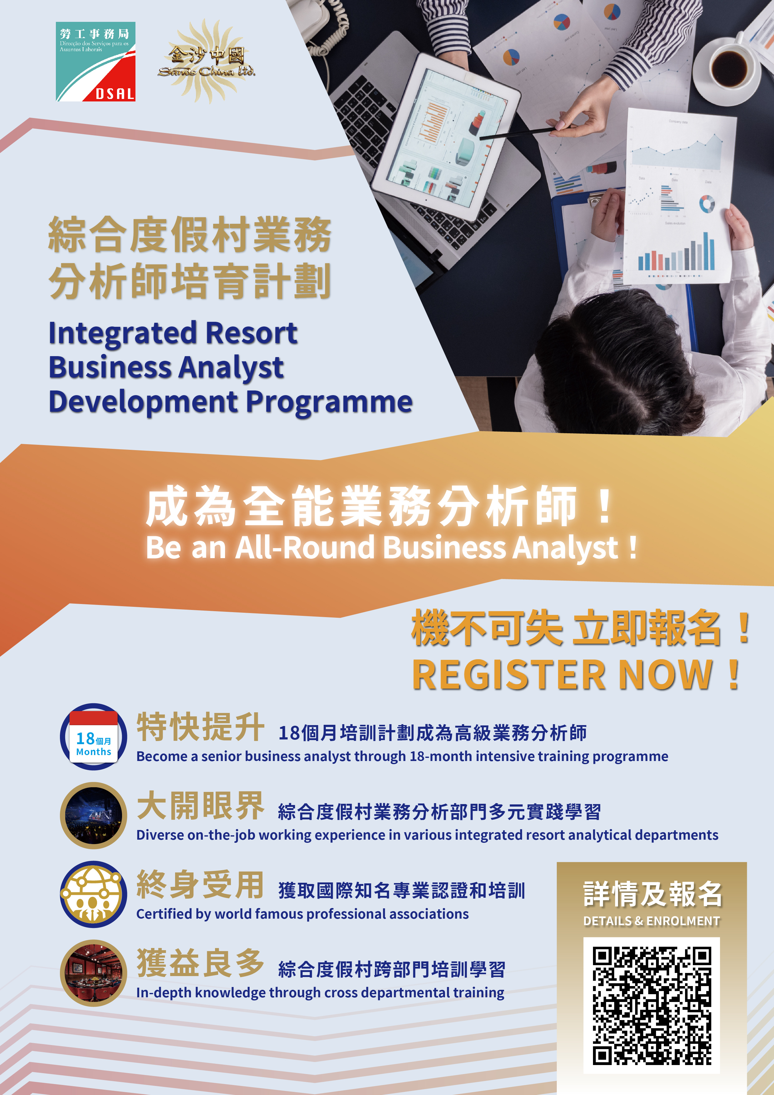 為進一步培育本澳大數據人才,並提供職涯發展階梯,勞工事務局和金沙中國有限公司(下稱“金沙中國")合作推出“綜合度假村業務分析師培育計劃"(下稱“計劃"),以“先入職、後培訓”方式,協助具條件和有意從事綜合度假村業務分析工作的澳門居民就業,計劃由7月4日起接受申請。