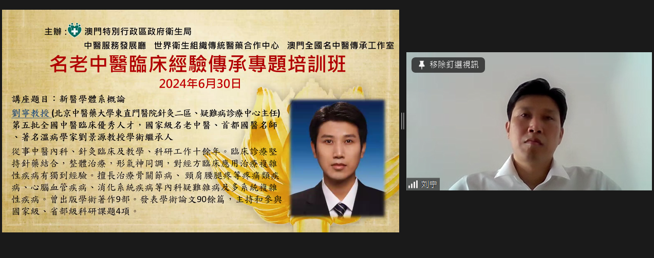 衛生局中醫服務發展廳、世界衛生組織傳統醫藥合作中心(澳門)、澳門全國名中醫傳承工作室日前以線上形式共同舉辦 “名老中醫臨床經驗傳承專題培訓班”,邀請全國名中醫劉景源教授、江蘇省名中醫郭宏敏教授和北京中醫藥大學東直門醫院劉寧主任,分別就“傷寒與温熱病初期的辨治之別”、“中醫養生與老年病臨床特徵及防治淺談”、“老年心腦疾患從瘀論治辨析”及“新醫學體系概論”進行專題講座,共吸引近500人次本澳中醫藥從業人員報名及參與。鄭成業副局長和世界衛生組織傳統醫藥合作中心莫蕙主任出席並主持活動。