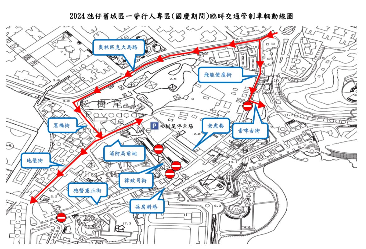 2024年10月1日至10月7日每日中午12時至晚上7時,飛能便度街與素啤古街交界、律政司街、施督憲正街,至告利雅施利華街與巴坡沙總督街交界之間的路段,包括兵房斜巷至嘉路士米耶馬路部分路段,將實施臨時交通管制措施。屆時車輛不能從飛能便度街與素啤古街交界轉入施督憲正街;車輛不能從律政司街駛入兵房斜巷。而居住在上述路段之居民,可遵從現場交通警員指示作有限度通行,進入臨時被管制路段之停車場。