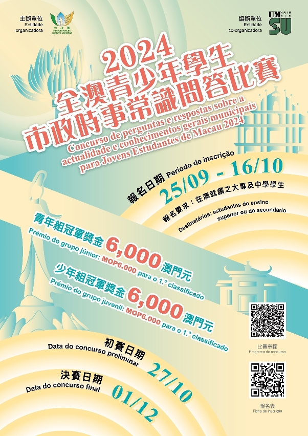 而為加深青年人認識市政署職能和工作,並了解澳門社區生活,從而增強對自己居住社區的歸屬感和認同感,市政署面向就讀於本澳中學及大專院校的學生舉辦“2024全澳青少年學生市政時事常識問答比賽”,報名期由即日起至十月十六日止。比賽分設大專組及中學組,每隊最多四人,可跨校組隊。