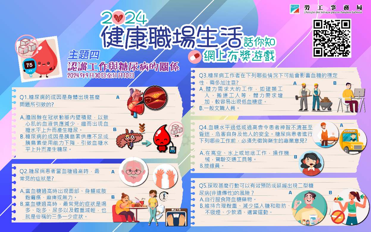 勞工局今年五月下旬開始分別推出四期以職業健康為主題的“健康職場生活話你知”有獎遊戲,以持續提升市民對職業健康的關注,第三期遊戲已於9月29日完滿結束。由9月30日起至11月10日期間繼續推出第四期有奬遊戲,主題為“認識工作與糖尿病的關係”,歡迎有興趣的市民可透過勞工局手機應用程式或掃描二維碼參與遊戲。