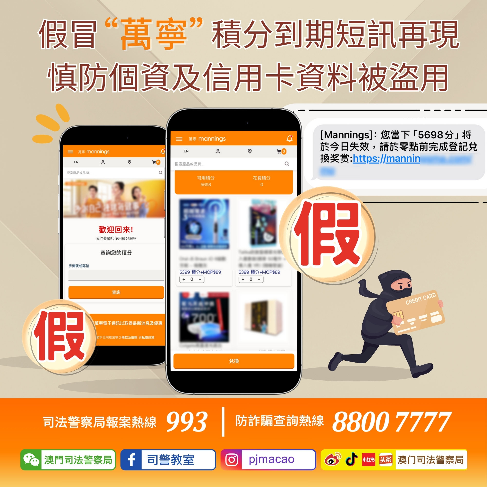 近日司法警察局發現騙徒再次假冒零售商“萬寧 Mannings”隨機向市民發送附有釣魚連結的短訊,內容訛稱市民積分即將失效,可登入短訊內附帶之連結以積分及低價換購禮品,誘騙市民輸入信用卡資料,騙徒成功套取後再進行非授權的大額交易。由11月4日至今,假冒“萬寧”的釣魚短訊已造成十多名市民受騙,合共造成損失折合超過30萬澳門元。