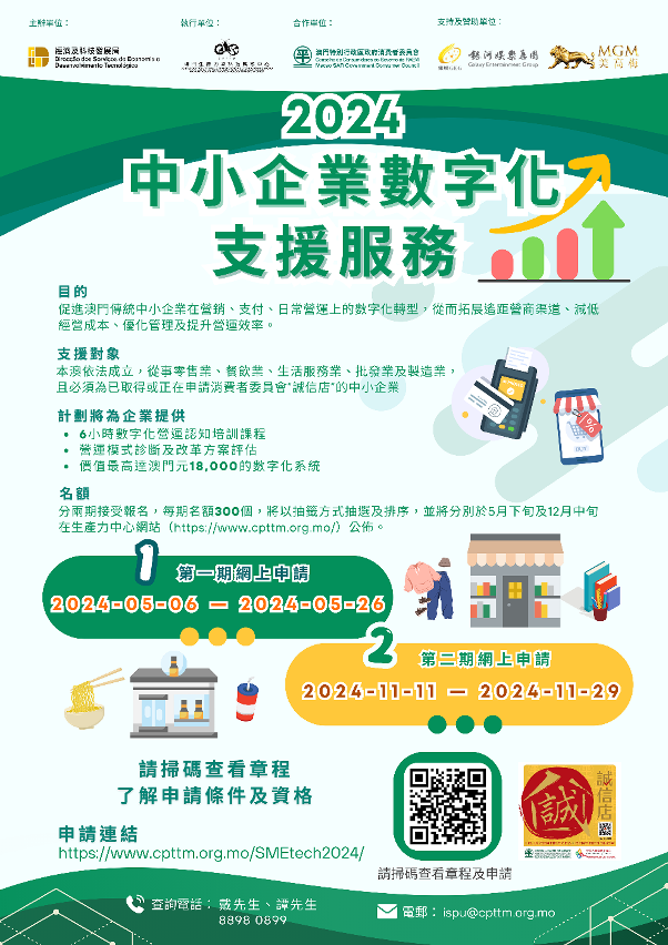為提升企業競爭力及營運效率,鼓勵中小企加快數字化轉型,經濟及科技發展局委託澳門生產力暨科技轉移中心承辦“2024中小企業數字化支援服務”,第二期計劃將於11月11日起接受企業申請,支援名額為300個。是次服務計劃獲消費者委員會作為合作單位,銀河娛樂集團和美高梅為支持及贊助單位。