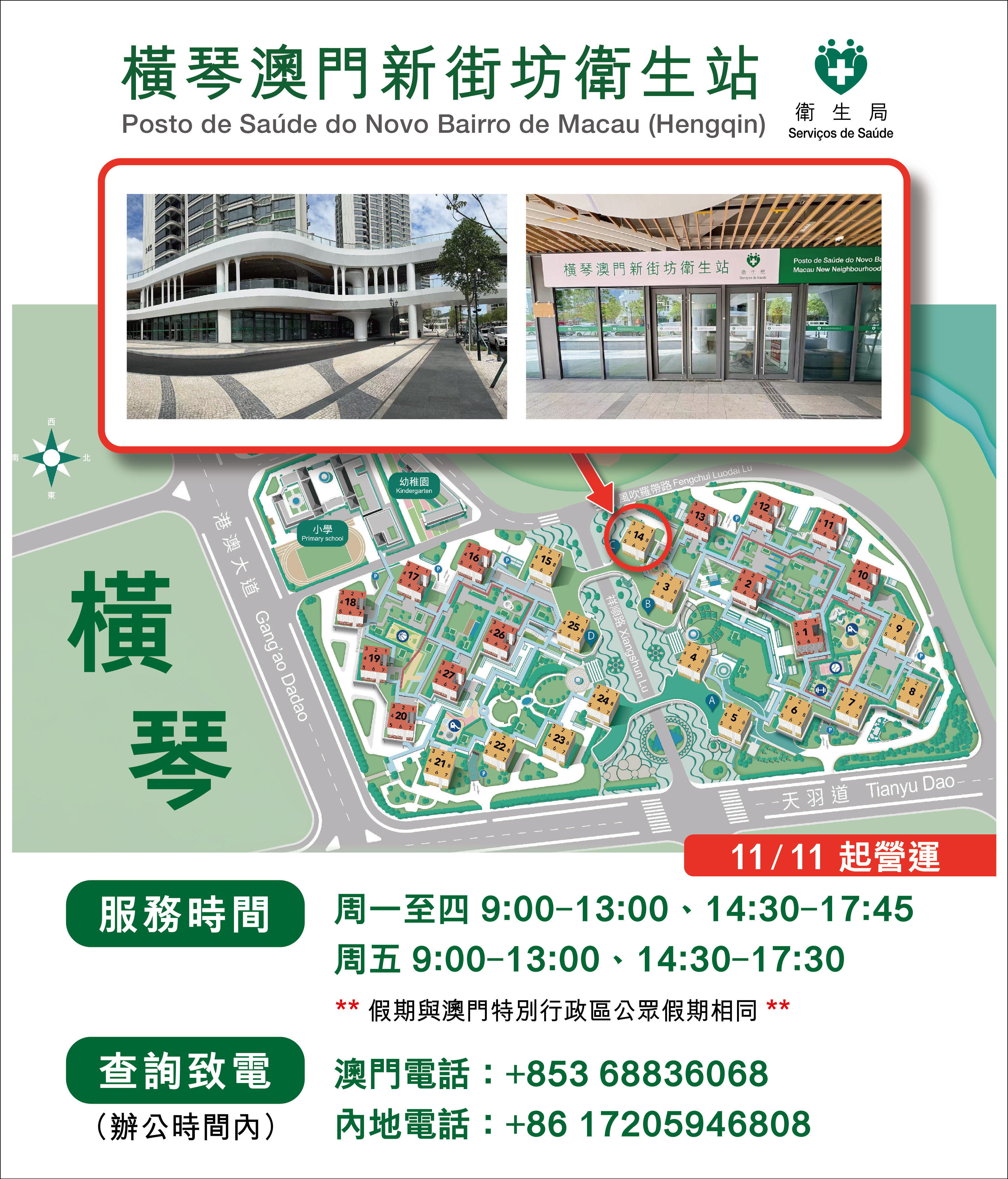 衛生站服務時間為星期一至四9:00-13:00及14:30-17:45,星期五9:00至13:00及14:30-17:30;假期與澳門特別行政區公眾假期相同,若有查詢可於辦公時間內致電澳門電話:+853 68836068或內地電話:+86 17205946808。