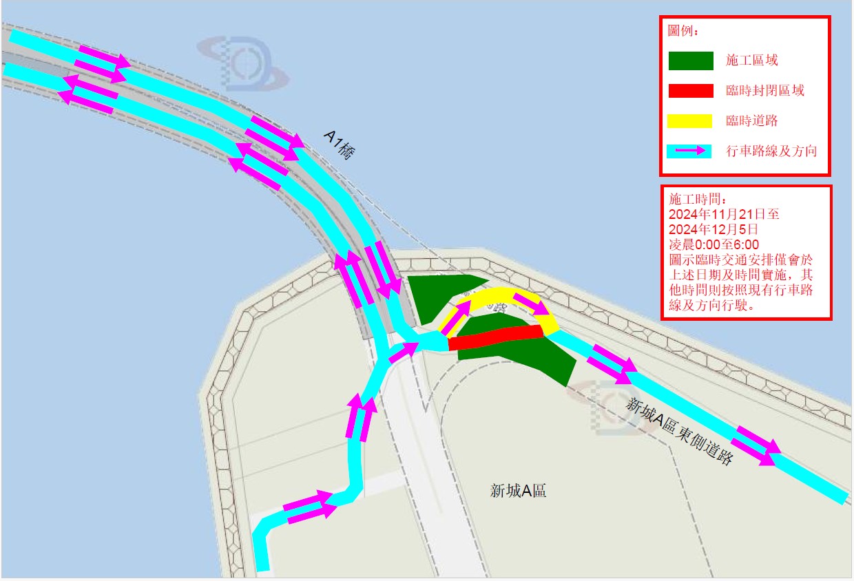 配合友誼圓形地行車天橋第二期建造工程的橋面吊裝工作,自2024年11月21日至2024年12月5日(每天凌晨0:00至6:00)實施臨時交通措施,駕駛者經A1橋(馬萬祺博士大馬路)進入新城A區後將使用臨時道路,部分行車道將改為單線行車,至於由新城A區經A1橋往澳門半島方向的車道及行駛路線則維持不變 (詳見附圖) ,請駕駛者留意現場交通指示標誌、遵守現場交通警員的指揮及安排。