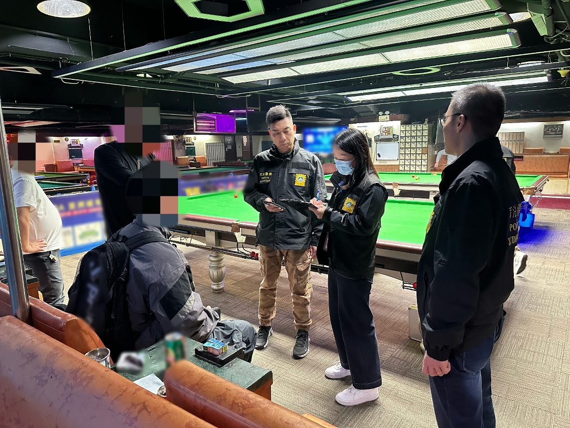 2024年12月12日下午5時至晚上8時,司警局共派出25名刑事偵查員前往澳門區及氹仔區共七間網吧及桌球室進行巡查,旨在打擊各類潛藏公共娛樂場所的違法犯罪活動。行動中合共截查了129人(123男6女),期間未有發現可疑人士或情況,故沒有任何人士被帶返司警局進行調查。