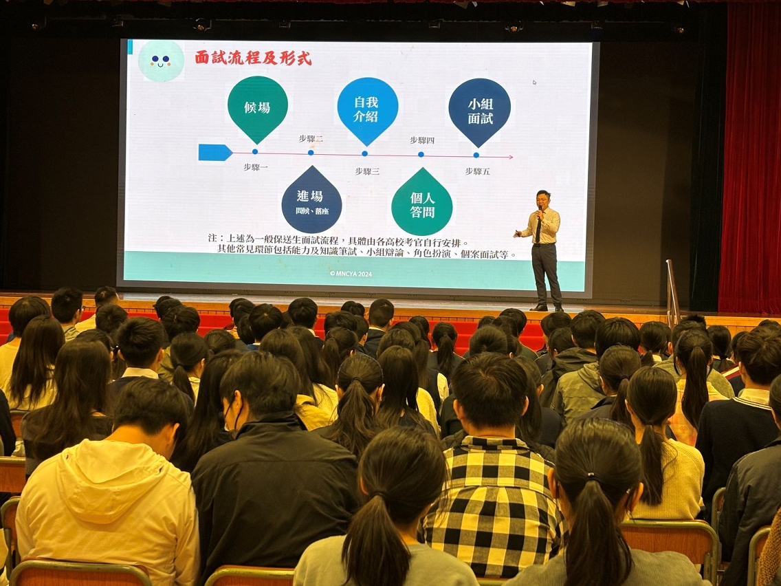 教育及青年發展局重視學生的生涯規劃,為學生到內地升學提供不同形式的支援。2025年中國內地普通高校聯合招收澳門保送生,共有121所內地高校招收澳門保送生,名額逾1,300個。日前共40所學校逾1,000名獲保送資格的應屆高中畢業學生,參加由教育及青年發展局主辦、澳門中華新青年協會承辦的“面試秘技—保送生考前輔導講座”,讓學生做好參加保送考試的準備,提前了解考試程序,掌握面試技巧,提高獲錄取的機會。