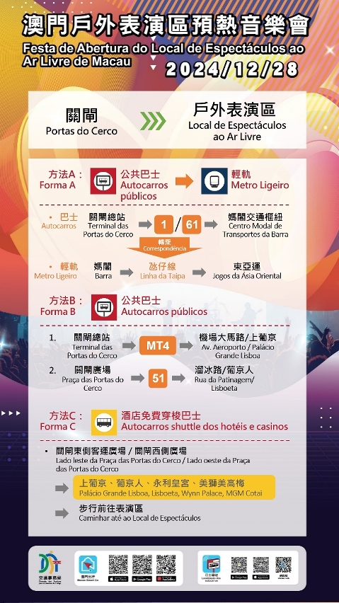 澳門戶外表演區將於12月28日晚上舉行首場演出活動,預計1萬5千觀眾參與,當天下午4時開始入場,活動約於晚上9時結束。配合演出安排及觀眾往返場地,當天表演區周邊道路會實施相應臨時交通管制措施,並會臨時調整公共交通服務安排以疏導人潮。交通事務局建議觀眾盡量使用公共交通及集體運輸工具往返演出場地,並留意最新交通資訊,提早規劃行程。