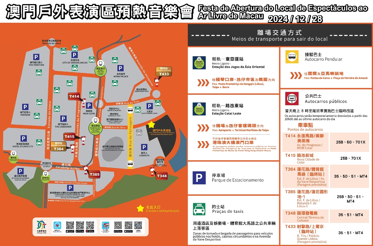 配合音樂會結束後觀眾離場的出行需要,巴士、輕軌將臨時調整服務,以進一步提升運載效率。屆時設有兩條免費接駁巴士路線,分別前往“亞馬喇前地”及“關閘”;輕軌採取分流安排,“東亞運”站前往橫琴口岸、氹仔市區及媽閣方向、“路氹東”站則前往機場及氹仔客運碼頭方向;乘客於氹仔客運碼頭可轉乘巴士103X路線前往港珠澳大橋澳門口岸。此外,觀眾亦可先步行前往周邊娛樂綜合體,乘搭的士或博企穿梭巴士離開。建議觀眾離場時留意現場指示牌及按照工作人員指引,根據目的地方向選擇合適的交通工具離開。