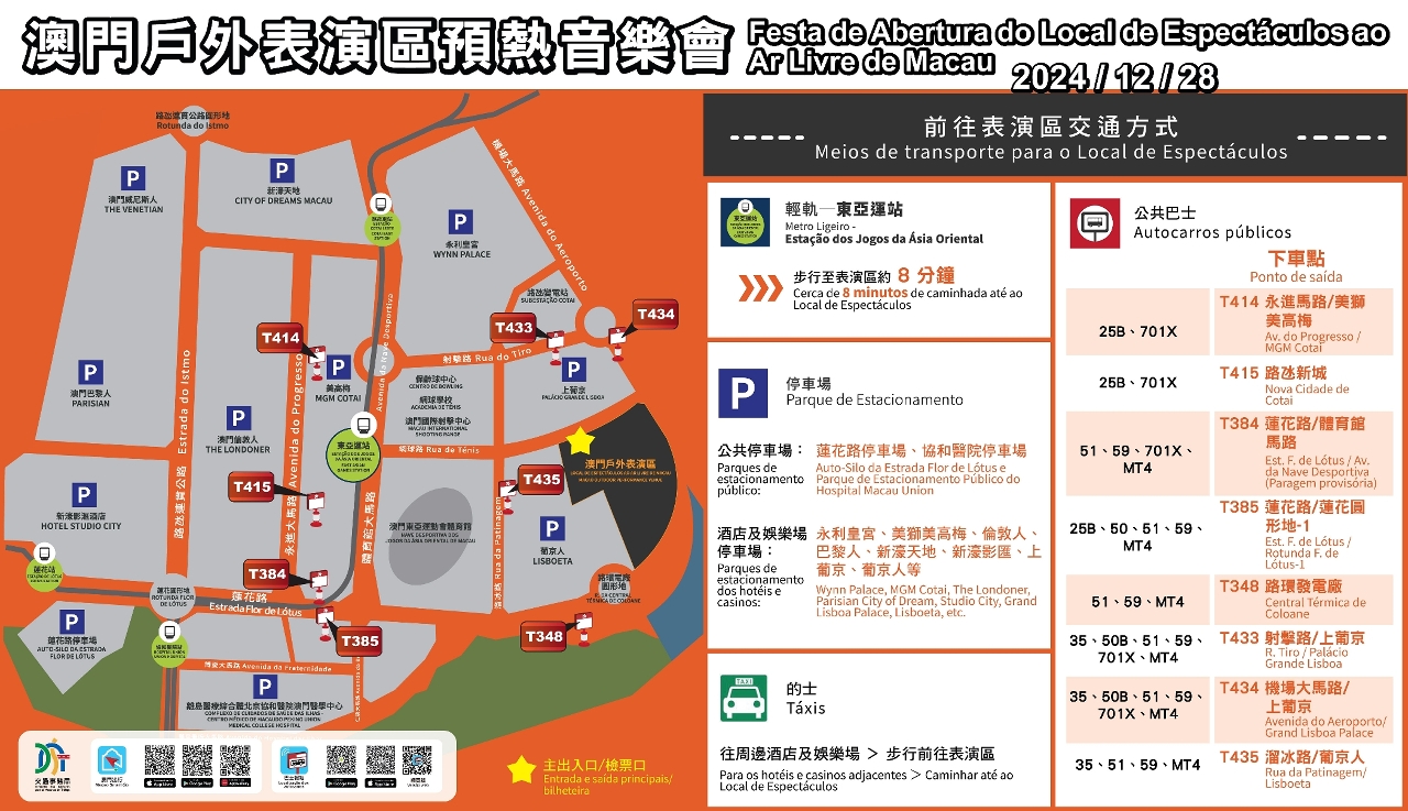 因應演出安排,觀眾入場及散場期間表演區周邊道路均會實施交通管制措施。機場大馬路往溜冰路方向的一段網球路由28日凌晨零時起實施封閉交通;下午4時起,路環電廠圓形地往網球路方向的一段機場大馬路實施封閉交通、蓮花路往射擊路方向的一段溜冰路實施車輛通行限制。晚上8時半起,機場大馬路、網球路、溜冰路、蓮花路及體育館大馬路均會實施臨時管制措施。配合有關安排,鄰近的巴士站點受影響需臨時停用,途經之日間巴士路線晚上8時起至尾班車期間改道行駛,屆時機場大馬路及永進大馬路會增設“射擊路/上葡京”及“蓮花路/體育館馬路”臨時站供乘客上落。有關戶外表演區音樂會當天的臨時交通安排,詳情可參閱附圖、附表及兩巴網站(澳巴:http://www.tcm.com.mo、新福利:http://www.transmac.com.mo)。