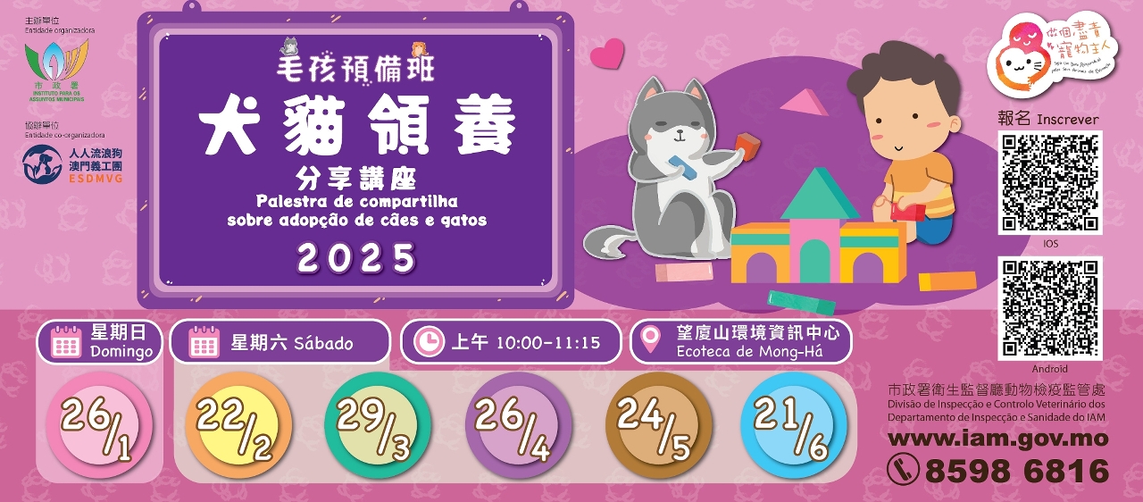 為推廣市政狗房犬貓領養服務及提升飼主責任認知,今年市政署繼續每月與動保團體合辦犬貓領養分享講座,活動將在望廈山環境資訊中心舉行,有意者可於即日起透過一戶通報名,歡迎以實際行動支持以領養代替購買,幫助更多毛孩找到溫暖的新家。