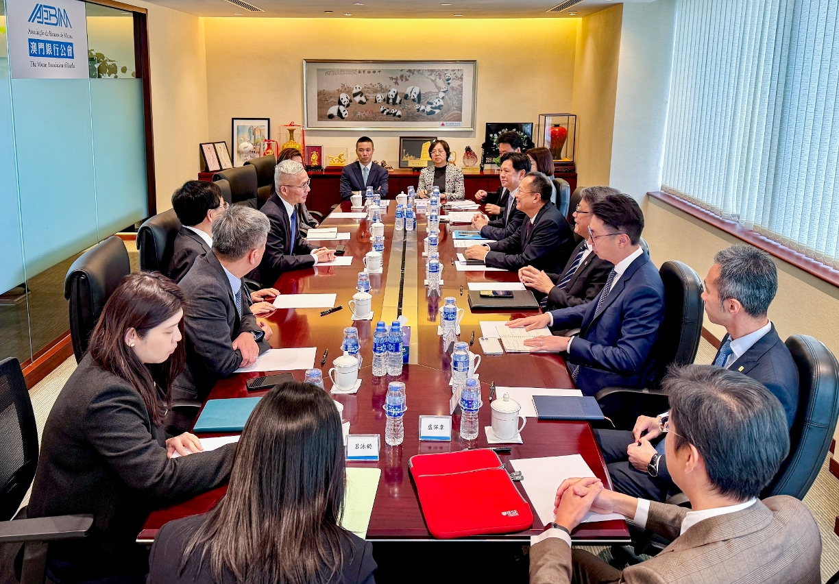 澳門銀行公會主席賈天兵、署理主席葉兆佳等歡迎司長一行到訪,並介紹新一屆理監事成員,雙方就澳門金融業發展、澳琴聯動發展、營商環境、中小企支援、人才培訓等議題交換意見。雙方表示會繼續保持緊密聯繫,共同推動金融業穩定發展。