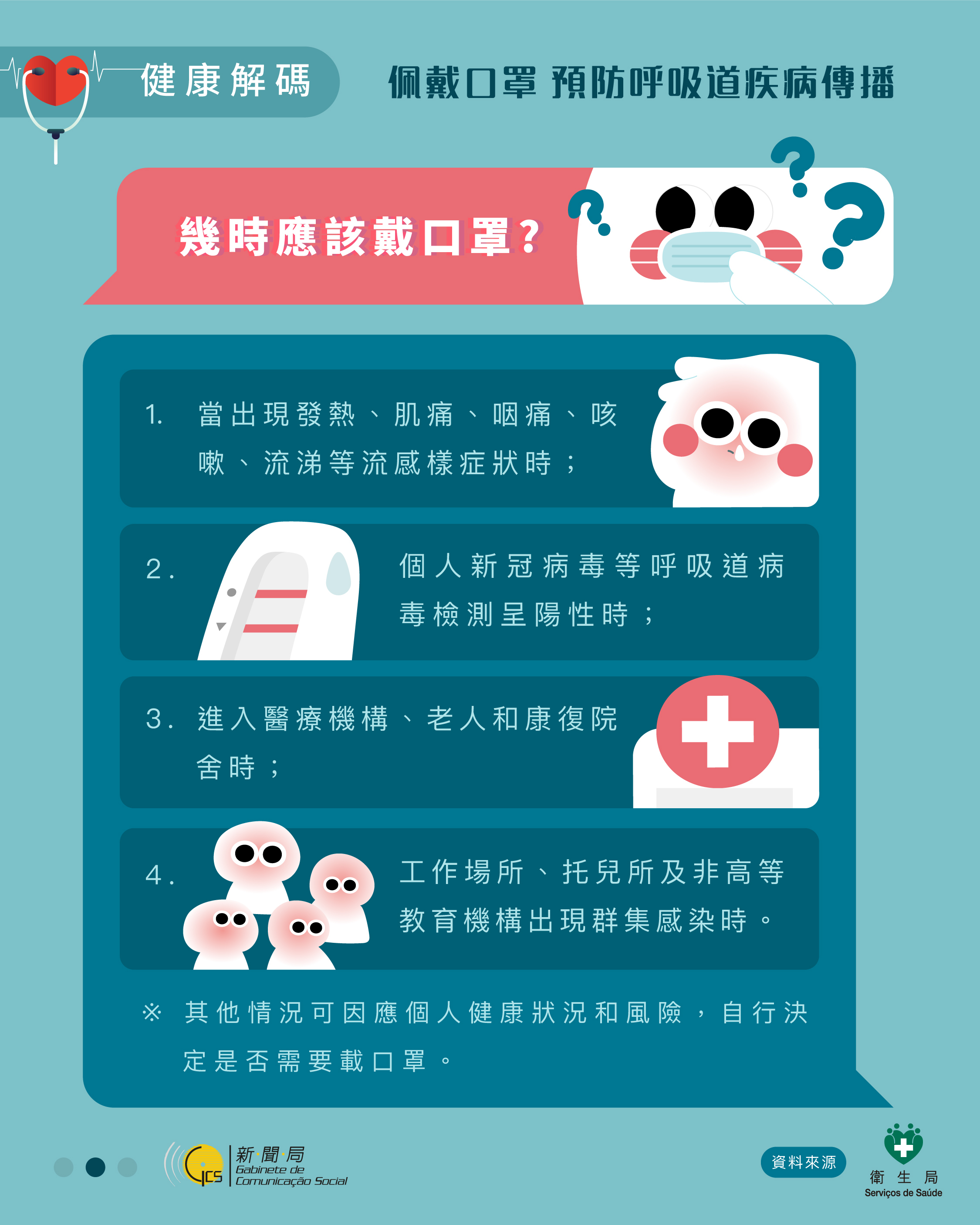 本澳正值流感高峰期,居民若有發燒、咳嗽等呼吸道不適症狀時,身體抵抗力便會下降,外出時應配戴口罩,以預防重疊感染其他呼吸道傳染病,避免病情加重,並可減少疾病傳播。即使身體無不適,外出時亦可隨身帶備口罩,以便有需要時戴上,預防感染呼吸道傳染病。